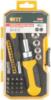 Материал: биты, переходник и хвостовик адаптера из хром-ванадиевой стали, головки и корпус адаптера из инструментальной стали с хромированным покрытием, отвертки из инструментальной стали и прорезиненного пластика. Упаковка: пластиковый прорезиненный кейс.