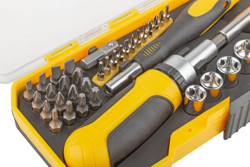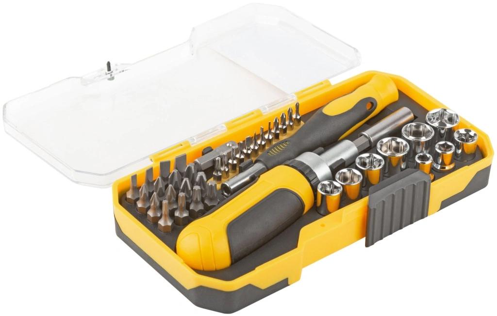 набор 41 шт., пластик.прорезиненный кейс FIT 56385 16 бит с магнитным наконечником; 12 бит для точных работ с магнитным наконечником; 9 головок: 5, 6, 7, 8, 9, 10, 11, 12, 13 мм; переходник с биты на головку; магнитный адаптер для быстрой смены бит (L=60 мм); отвертка реверсивная; отвертка для точных работ