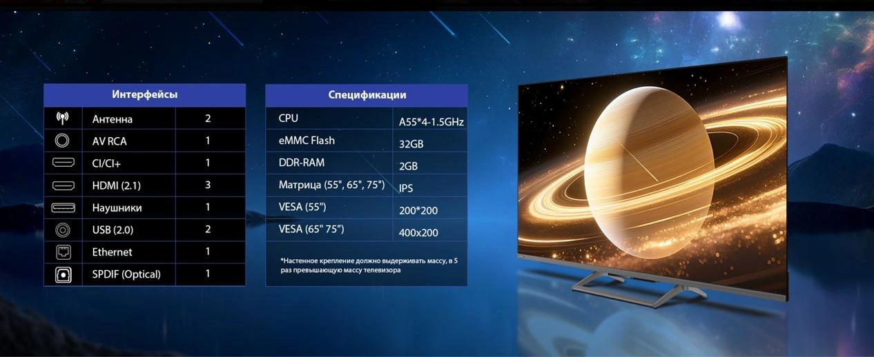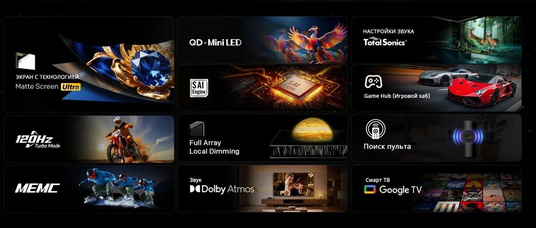 Адаптивный датчик освещенности; Трансляция экрана смартфона на ТВ; Режим Filmmaker Mode; Технология естественной передачи оттенков кожи AI Skin Detection с ИИ; Технология улучшения четкости AI Motion Clarity с ИИ, Технология MEMC; Технологии защиты зрения: Low Blue Light (сниженный синий свет)