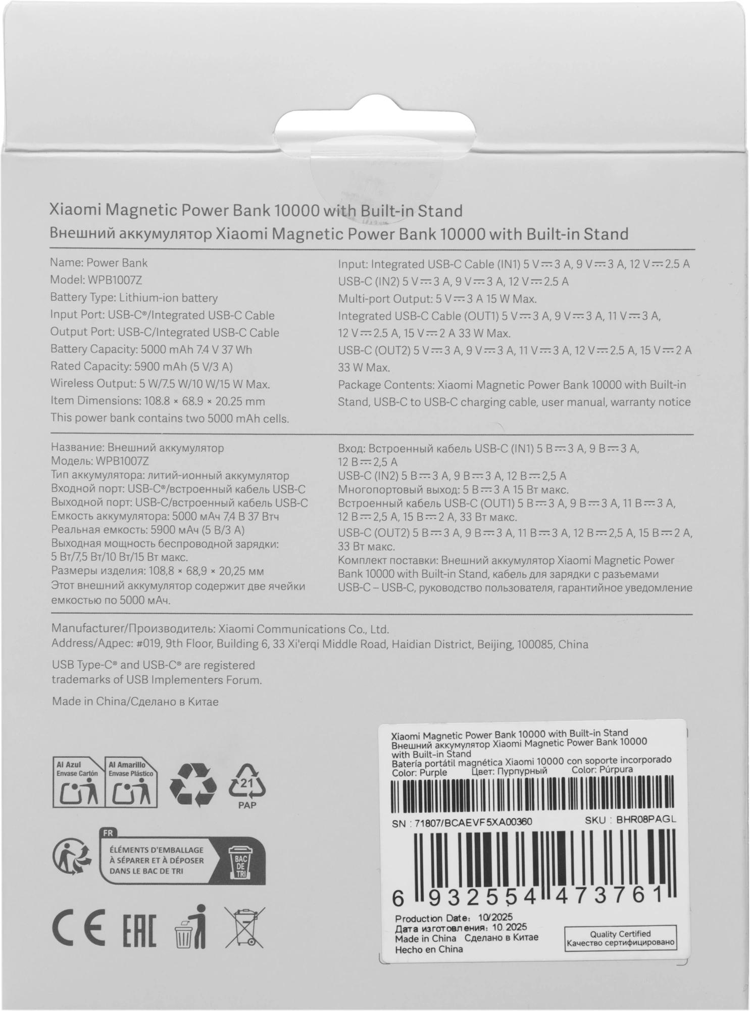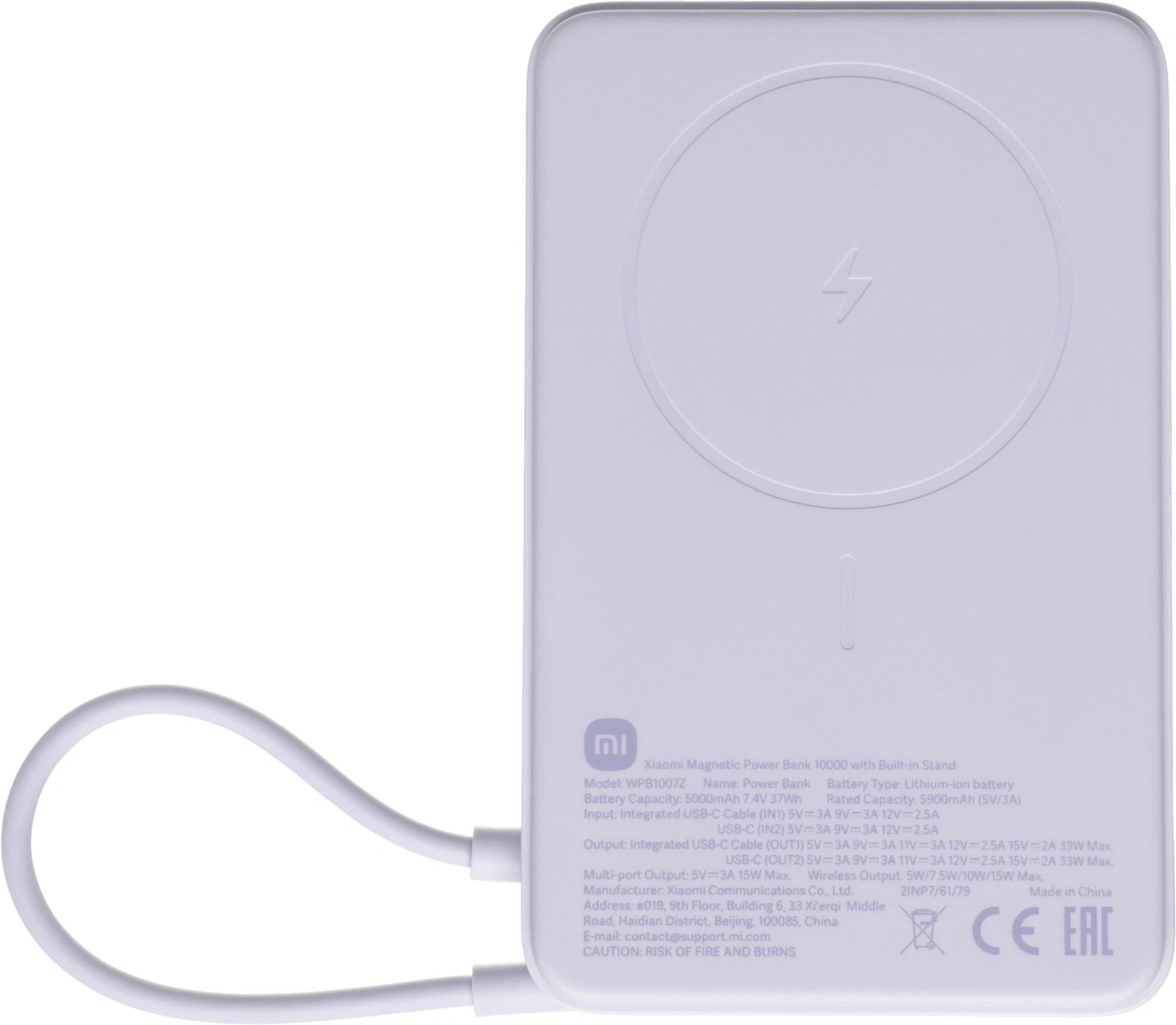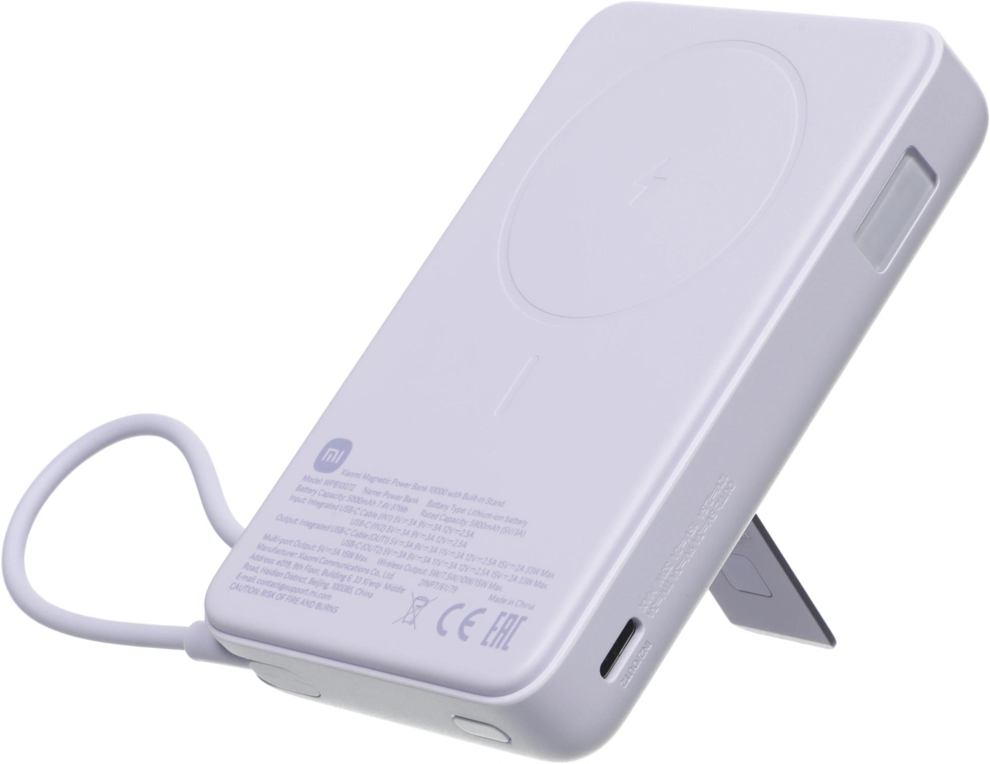 Мобильный аккумулятор Xiaomi Magnetic BHR08PAGL 10000mAh QC3.0/PD3.0 33W 3A USB-C беспров.зар. фиолетовый
