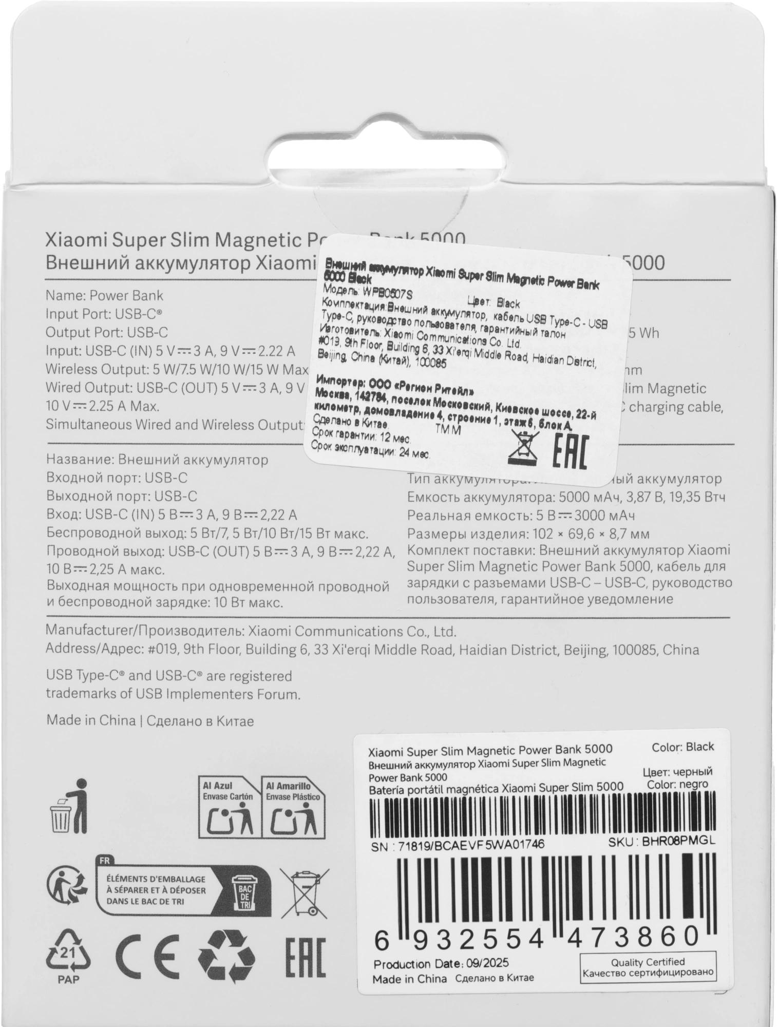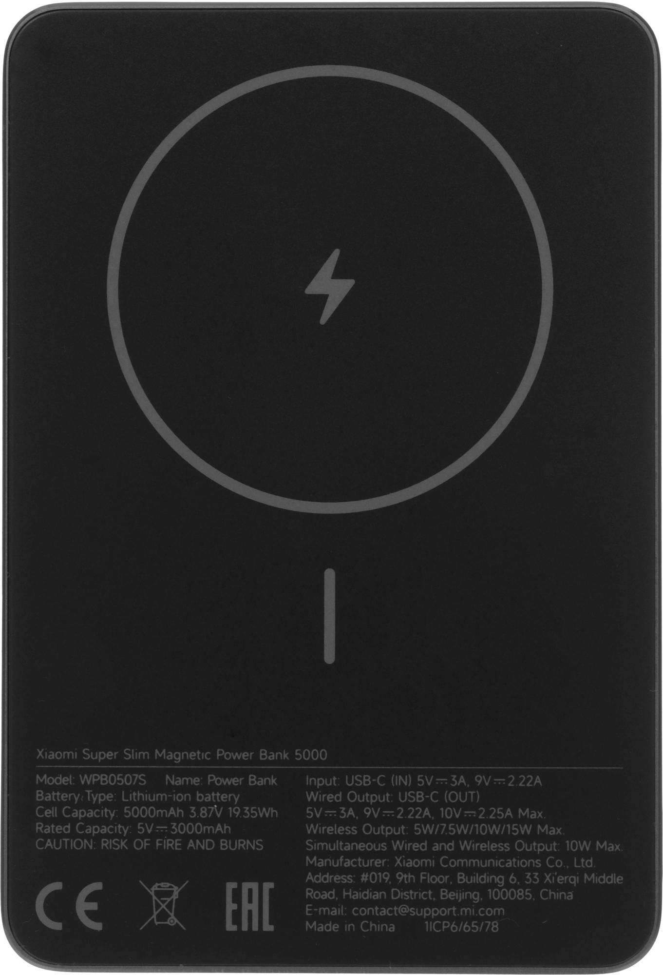 Мобильный аккумулятор Xiaomi Super Slim Magnetic 5000mAh QC3.0/PD3.0 22.5W 3A USB-C беспров.зар. черный (BHR08PMGL)