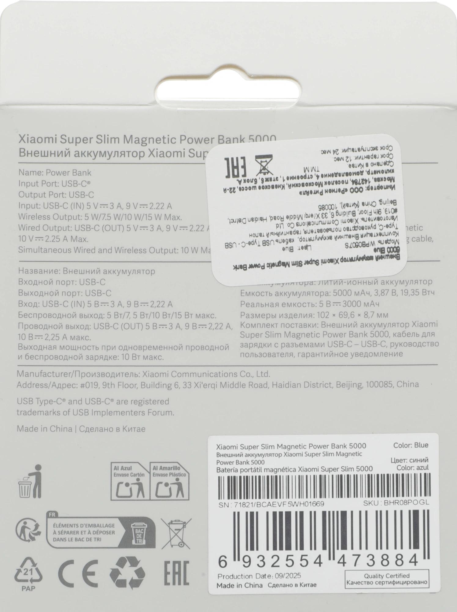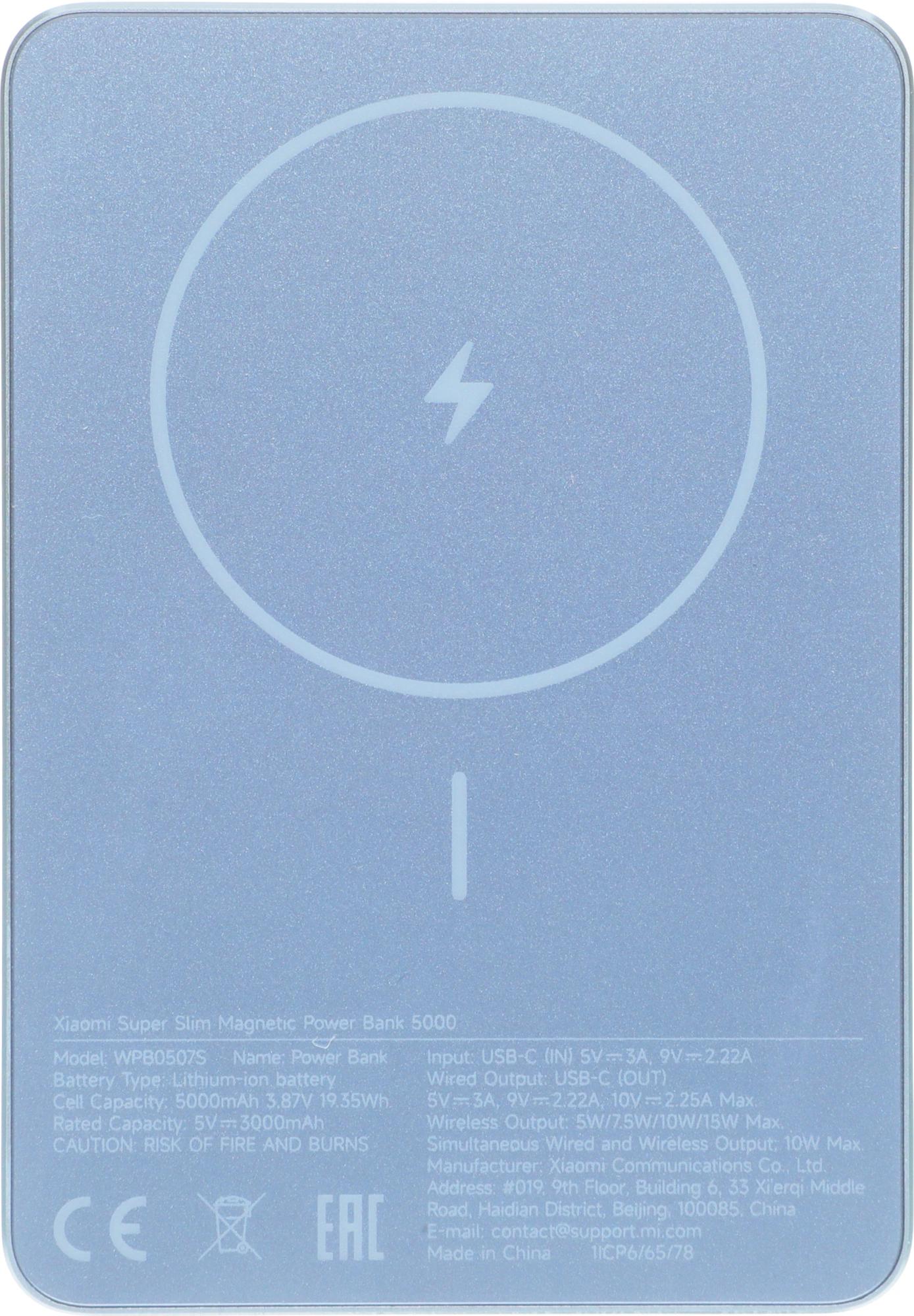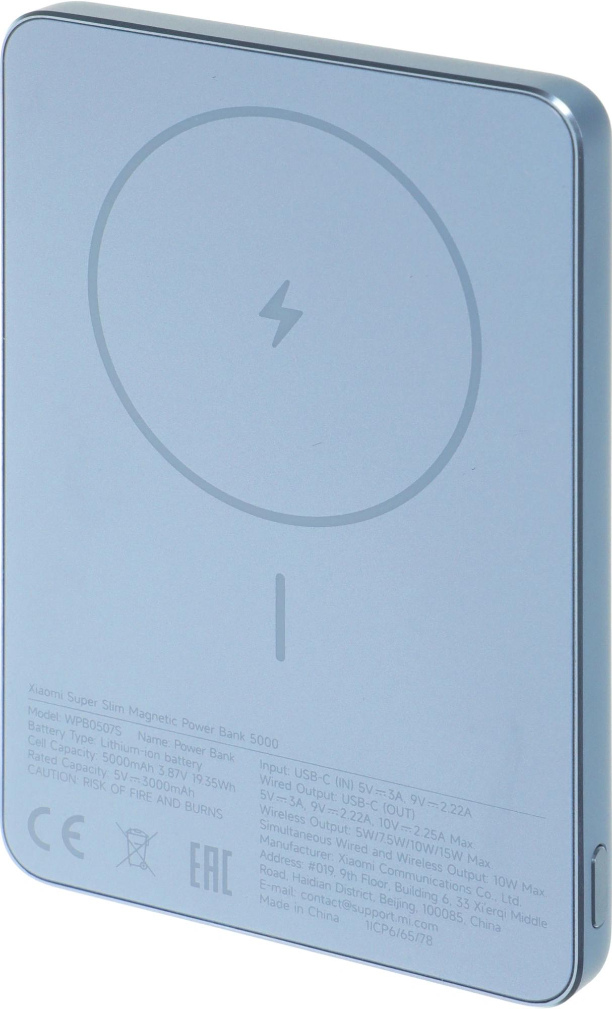 Мобильный аккумулятор Xiaomi Super Slim Magnetic 5000mAh QC3.0/PD3.0 22.5W 3A USB-C беспров.зар. голубой (BHR08POGL)