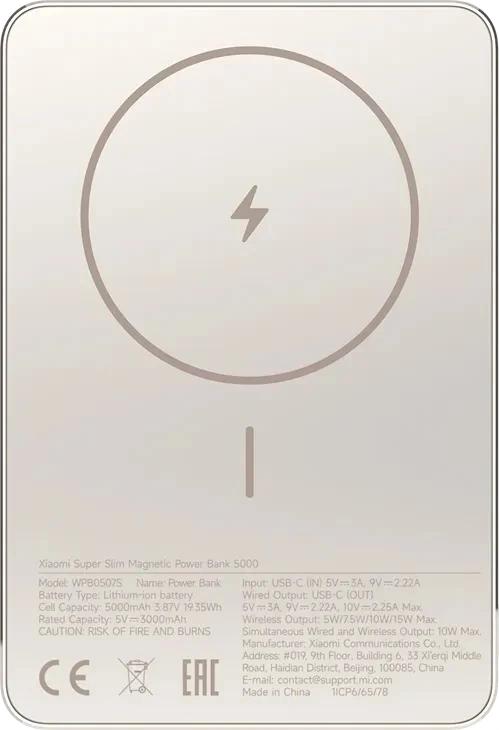 Мобильный аккумулятор Xiaomi Super Slim Magnetic 5000mAh QC3.0/PD3.0 22.5W 3A USB-C беспров.зар. золотистый (BHR08PLGL)