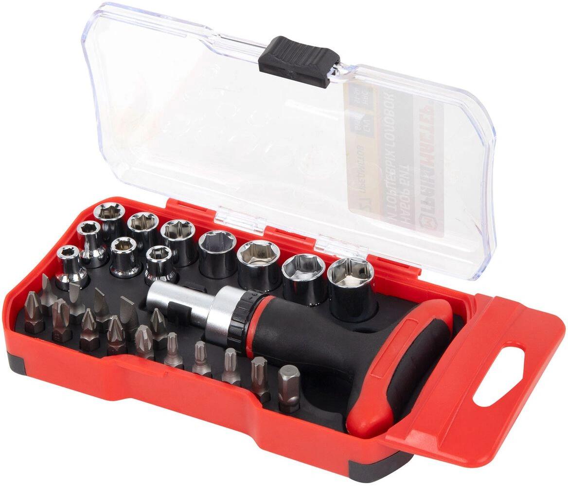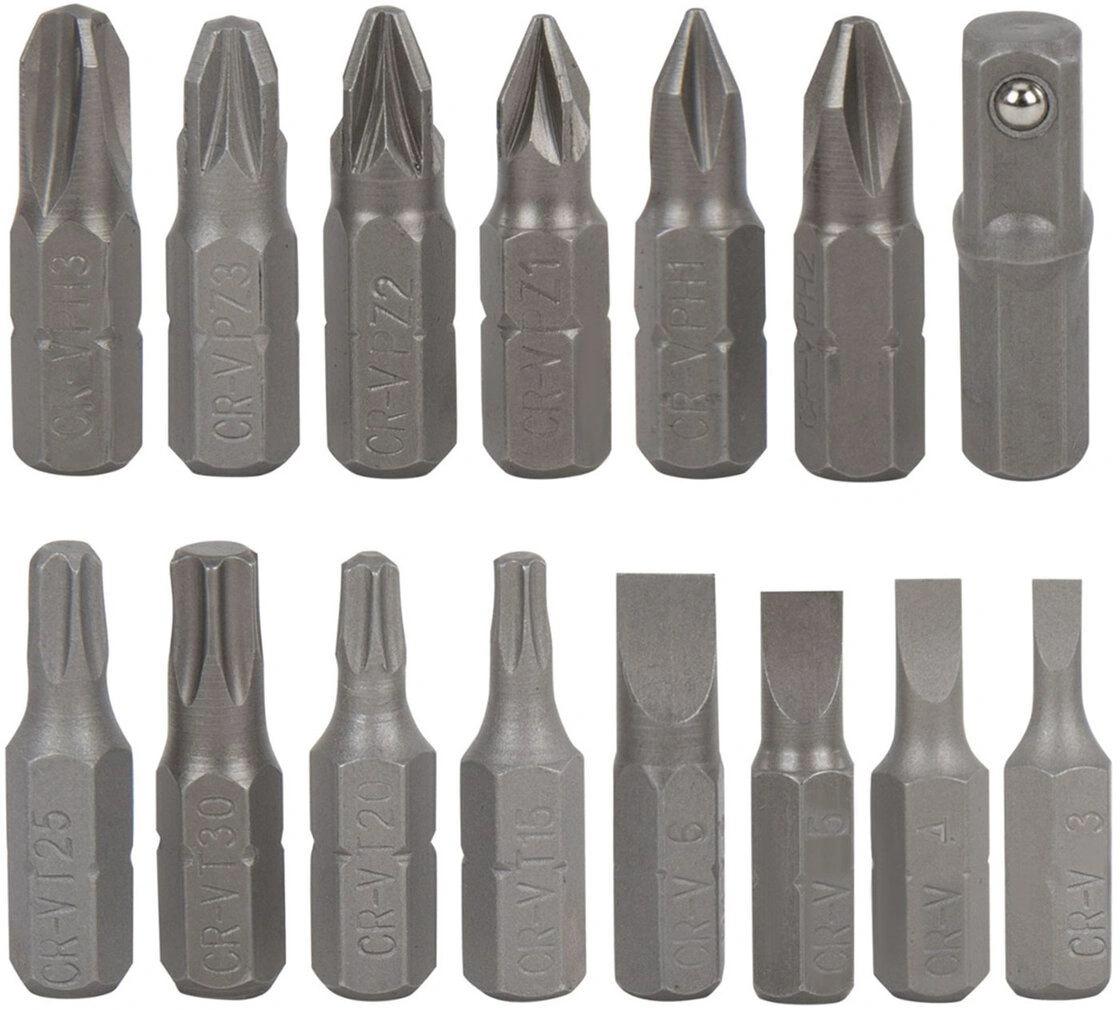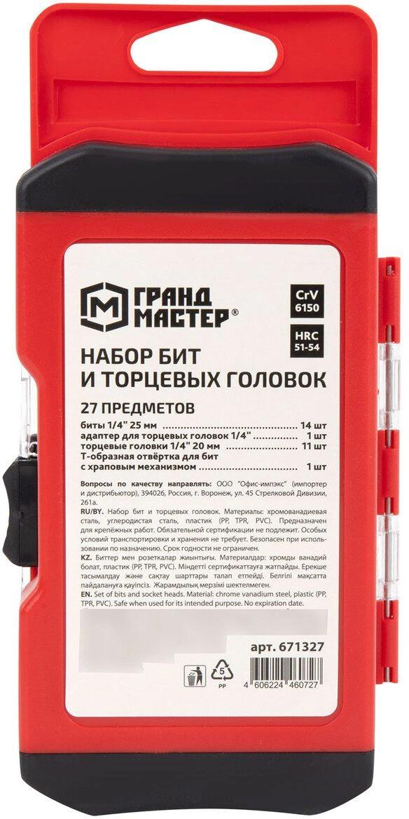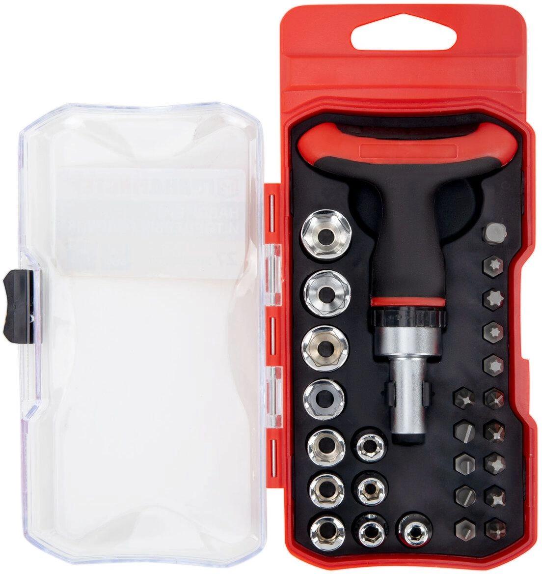 1 ШТ. - Т-ОБРАЗНАЯ ОТВЁРТКА ДЛЯ БИТ С ХРАПОВЫМ МЕХАНИЗМОМ. 14 ШТ. - БИТЫ 1/4" 25 ММ (SL: 3, 4, 5, 6; PH: 1, 2, 3; PZ: 1, 2, 3; T: 15, 20, 25, 30). 1 ШТ. - АДАПТЕР ДЛЯ ТОРЦЕВЫХ ГОЛОВОК 1/4". 11 ШТ. - ТОРЦЕВЫЕ ГОЛОВКИ 1/4" 20 ММ (4, 5, 5.5, 6, 7, 8, 9, 10, 11, 12, 13).