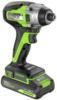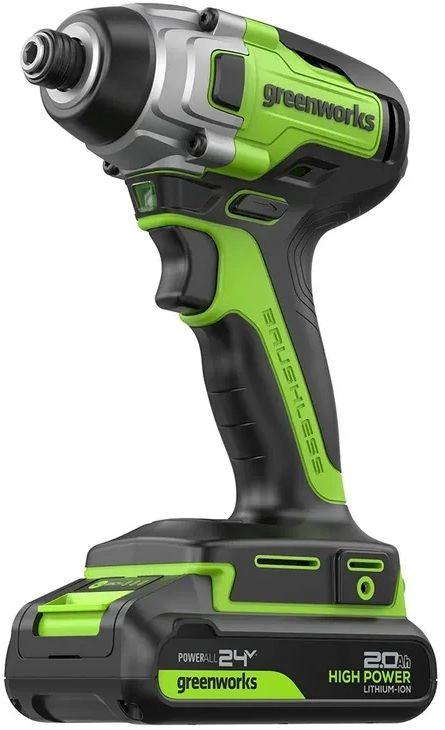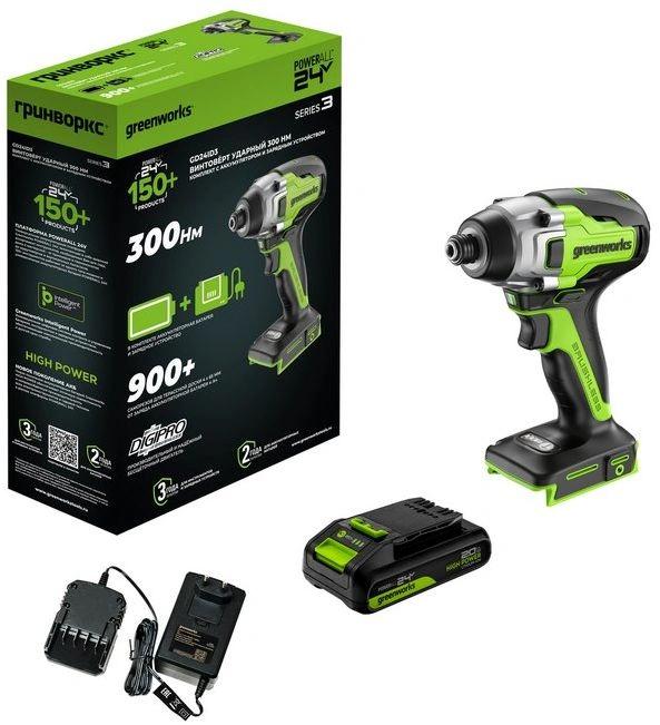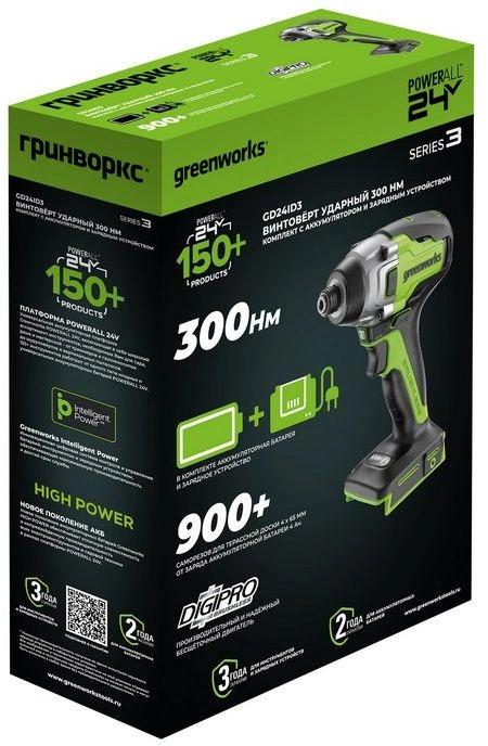 Винтоверт ударный Greenworks 3802807CUA (GD24ID3); поясная клипса + винт; АКБ 2Ач High Power; зарядное устройство; руководство по эксплуатации; гарантийный талон; картонная коробка.