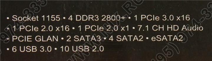 | Порты | 1x PS/2 клавиатура, 4x USB 3.0, 4x USB 2.0, 1x ESATA, 1x RJ-45 LAN, 1x VGA монитор, 1x DVI-D, 1x HDMI, 1x оптический S/PDIF-out, Line-in, Mic-in, Front-out, rear-out, sub/center-out |