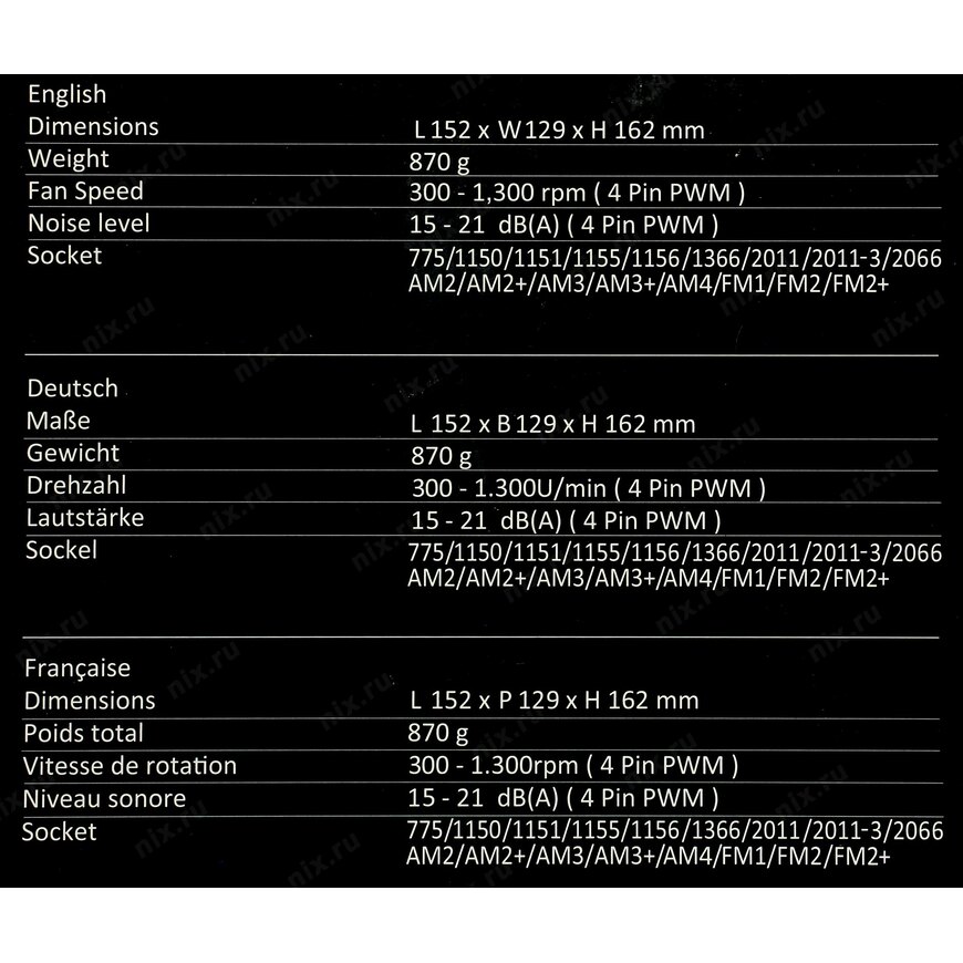 | Совместимость охлаждения | Socket LGA2066 Square ILM, Socket LGA2011-3 Square ILM, Socket LGA2011 Square ILM, Socket LGA1366, Socket LGA1200, Socket LGA1151, Socket LGA1150, Socket LGA1155, Socket LGA1156, Socket LGA775, Socket FM2 plus, Socket FM2, Socket FM1, Socket AM3 plus, Socket AM3, Socket AM2 plus, Socket AM2 |
