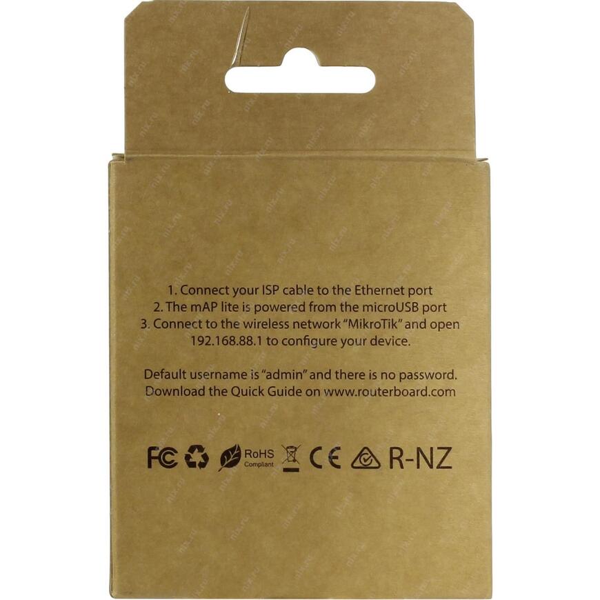 | Описание | Mikrotik mAP lite (RBmAPL-2nD) - новый компактный роутер от компании Mikrotik, оснащенный WiFi радиомодулем (работающий на частоте 2.4 ГГц (802.11b/g/n) и классическим Ethernet портом |