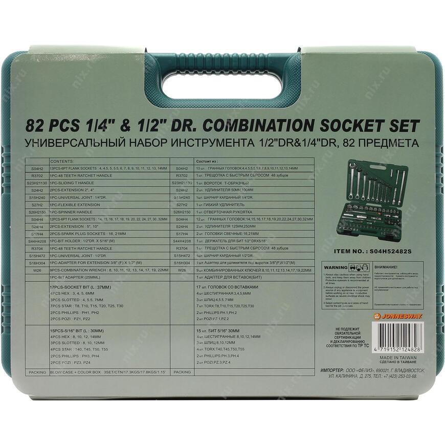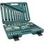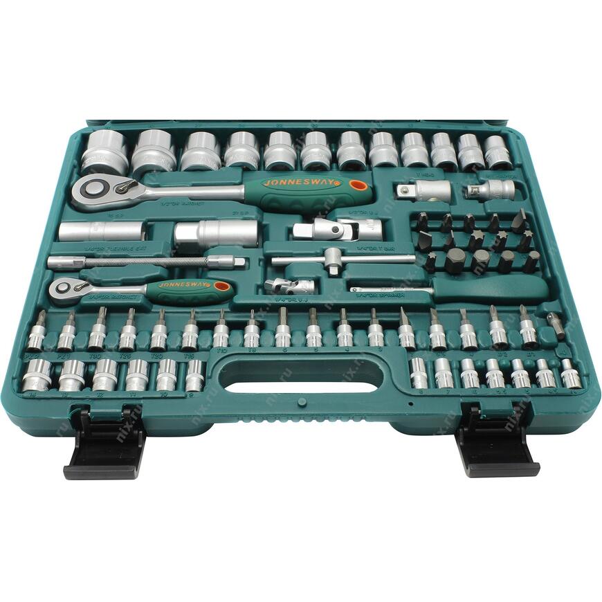 Набор инструмента в чемодане для автомобиля включает торцевые головки, в том числе свечные головки, под квадрат 1/4" или 1/2" (всего 25 штук), два ключа-трещотки, удлинители для головок, карданы, воротки, отвертку-вороток (держатель для бит и головок отвёрточного типа), а также набор вставок (биты) 5/16" и биты насадки (квадрат 1/4") под шлицы TORX, PHILLIPS, POZI, прямые и шестигранные шлицы разных размеров (32 шт.). Также в комплекте набор комбинированных гаечных ключей (9 шт.)