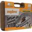 | Описание | Набор инструмента в чемодане для автомобиля включает торцевые головки с шестигранным профилем, в том числе свечные головки, под квадрат 1/2" (18 обычных и 2 свечные), ключ-трещотку, вороток Т-образный, кардан и удлинители для головок |