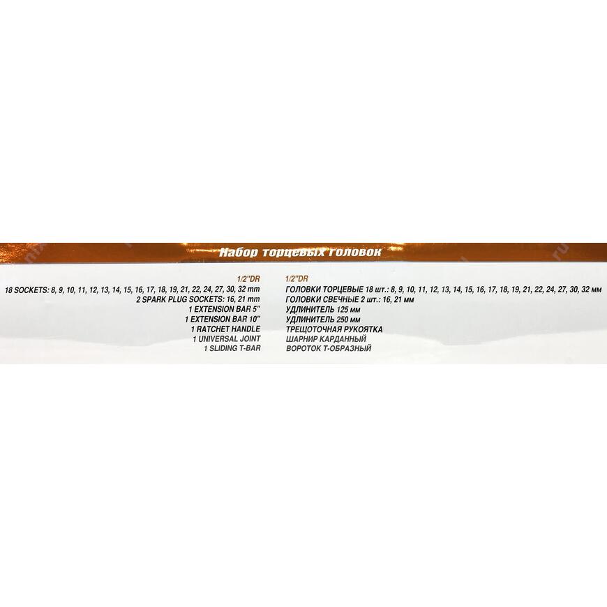 | Тип инструмента в наборе | Удлинитель для торцевых головок (квадрат 1/2" M -> F), Кардан (квадрат 1/2" M -> F), Вороток Т-образный для торцевых головок 1/2", Ключ трещотка для торцевых головок 1/2", Торцевые головки 1/2", Торцевые головки свечные 1/2" |