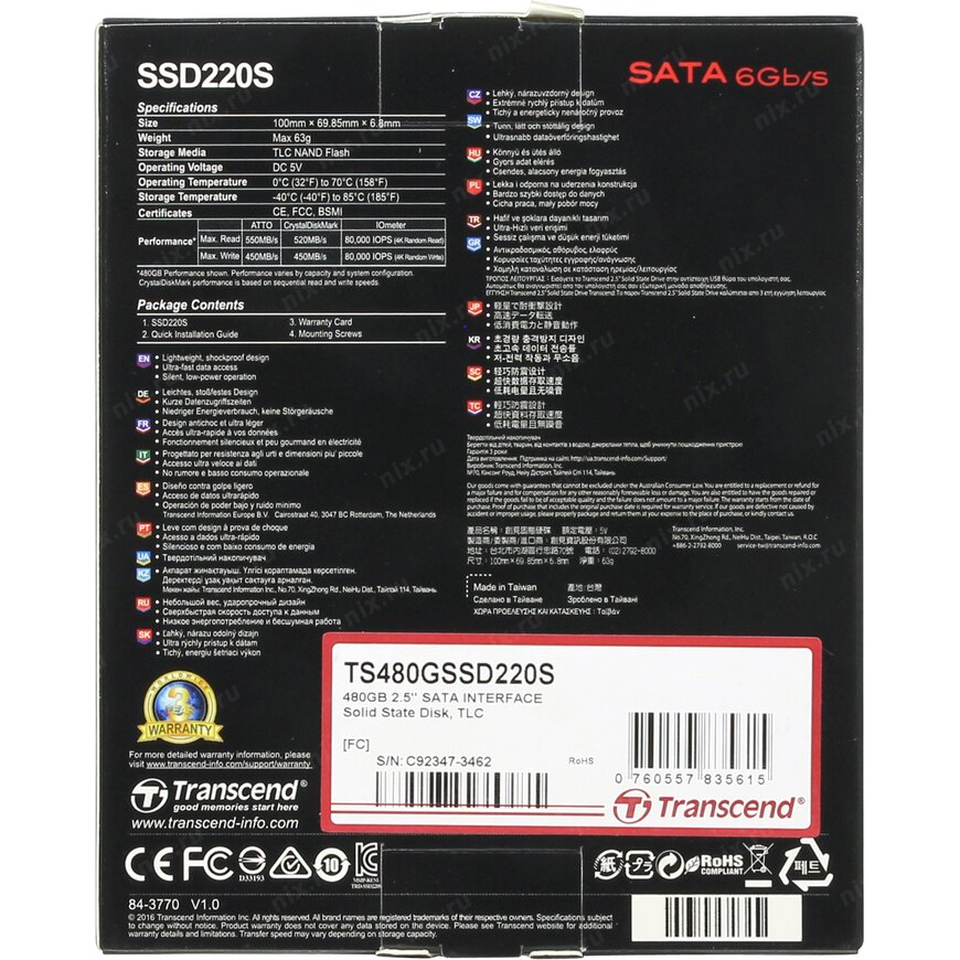 | ПО в комплекте | SSD Scope (диагностика и обслуживание SSD, перенос данных со старого жесткого диска на новый SSD) скачивается с сайта производителя |