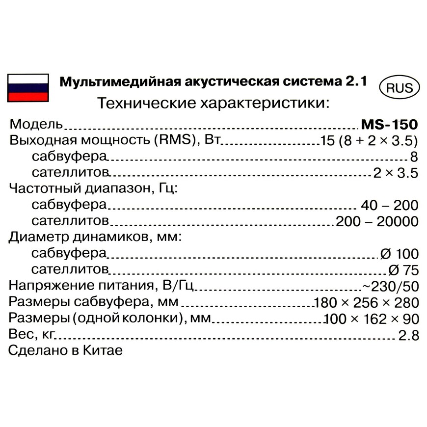 | Динамики колонок | Сабвуфер: 100 мм; сателлиты: 75 мм |