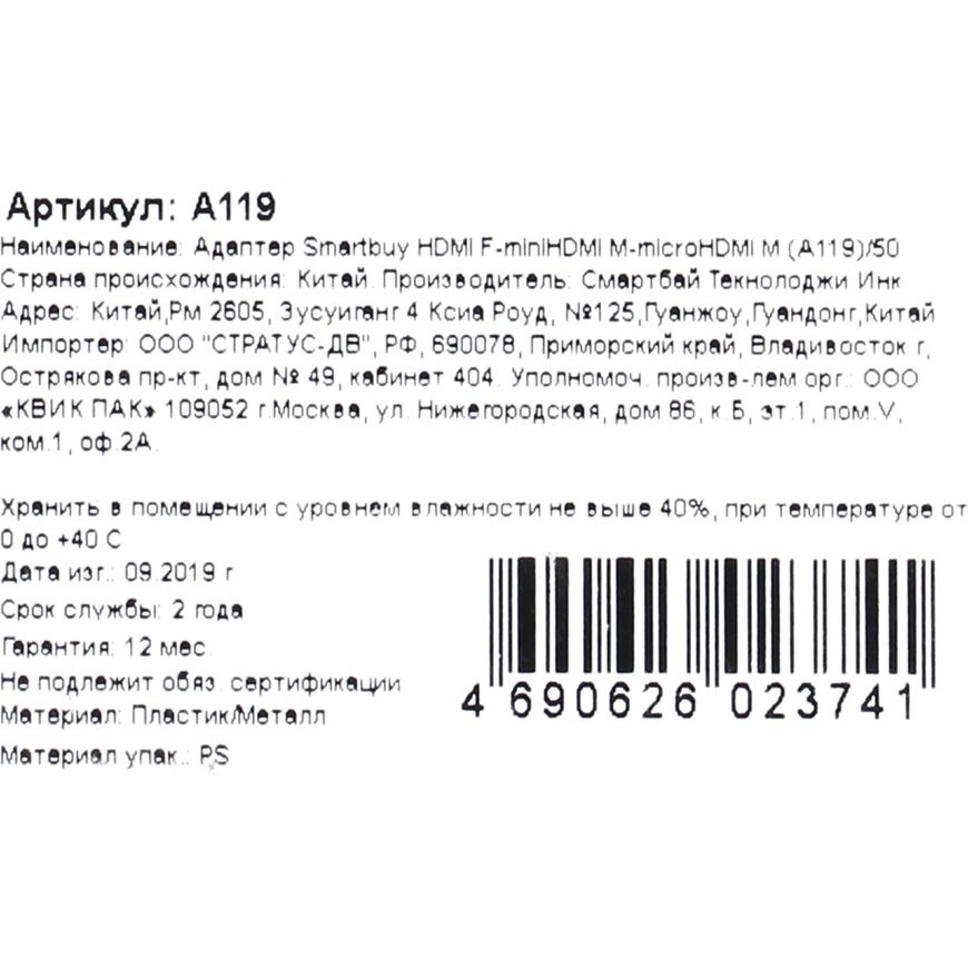 | Разъемы кабеля или переходника | HDMI 19F, HDMI Type C (Mini), HDMI Type D (Micro) |