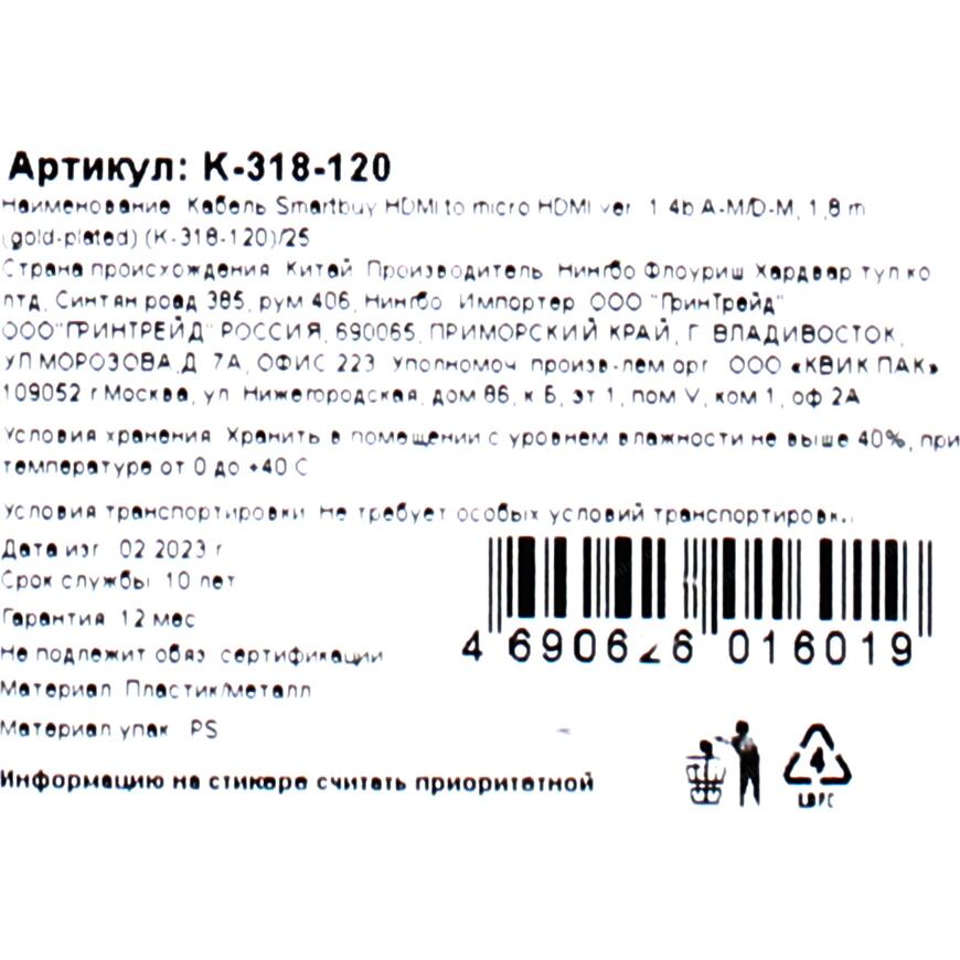 | Разъемы кабеля или переходника | HDMI 19M, HDMI Type D (Micro) |