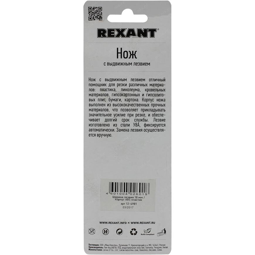 Нож с выдвижным лезвием - это отличный помощник для резки бумаги, пластика, линолеума, картона, гипсокартонных, гипсолитовых плит и других материалов. Канцелярский нож Rexant оснащен самофиксирущимся лезвием шириной 18 мм