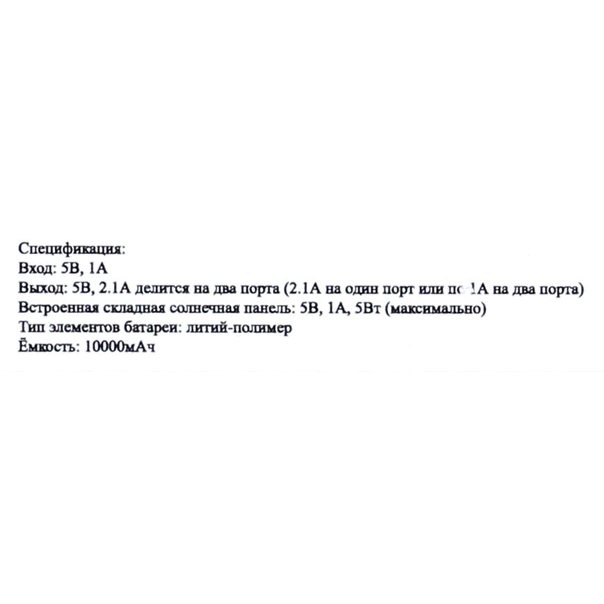 | Емкость аккумулятора | 10000 мАч (заявленная производителем ёмкость внутреннего аккумулятора Power Bank; реальная отдаваемая ёмкость Power Bank в пересчете на напряжение 5 В может отличаться в меньшую сторону) |