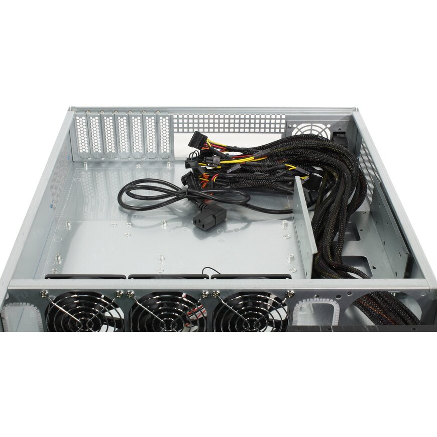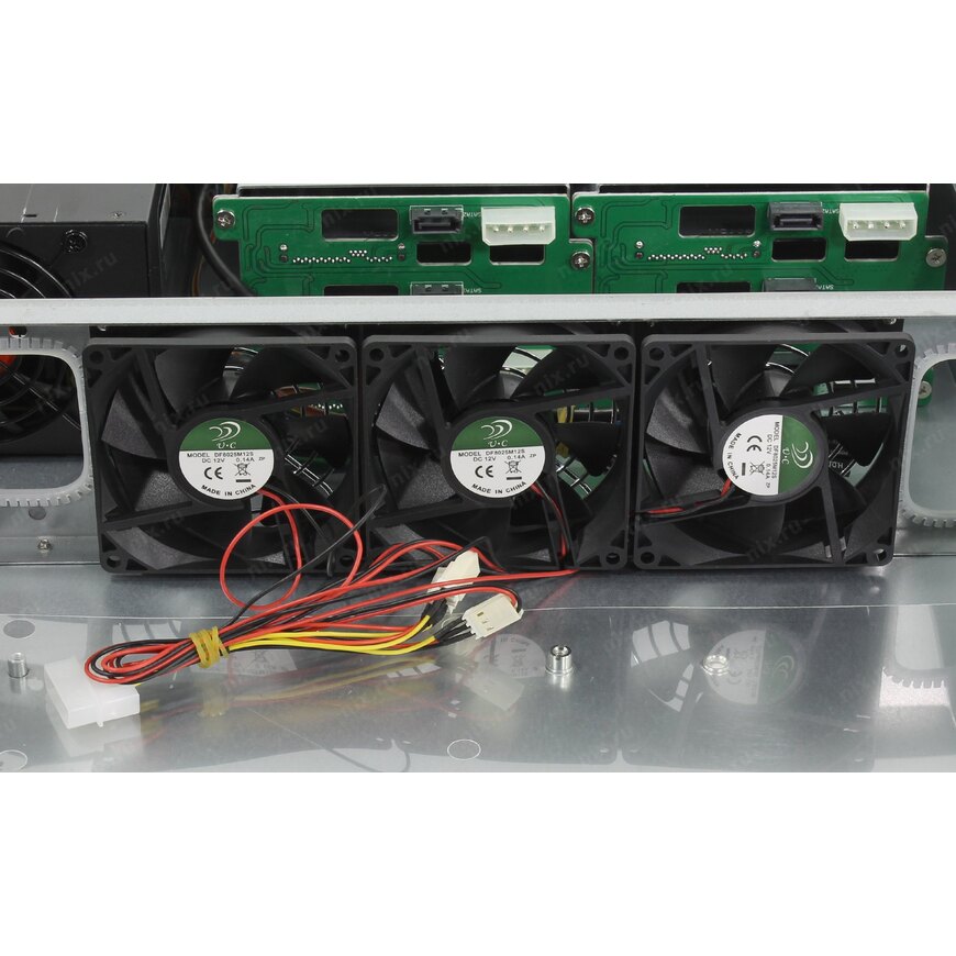 | Место для вентилятора на передней стенке | 3 вентилятора: 80 x 80 мм, расположены на перегородке в средней части корпуса |