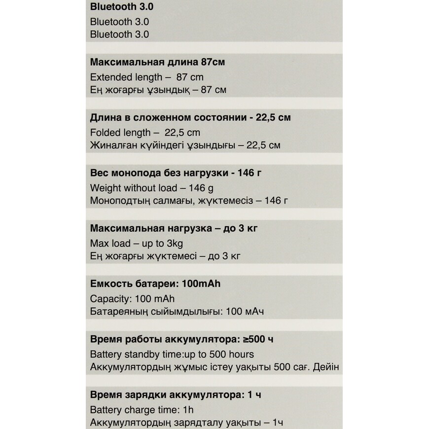 | Описание | Легкий, прочный, компактный телескопический селфи-монопод (палка для селфи) из алюминия и других качественных материалов со встроенным Bluetooth 3.0 адаптером и кнопками спуска затвора, увеличения/уменьшения, смена камеры с фронтальной на основную и обратно. Подходит для смартфонов на базе Android или iOS, а также для экшн-камер GoPro HERO (или аналогов). Монопод многосекционный-раздвижной и может раскладываться с 225 мм до 870 мм. |