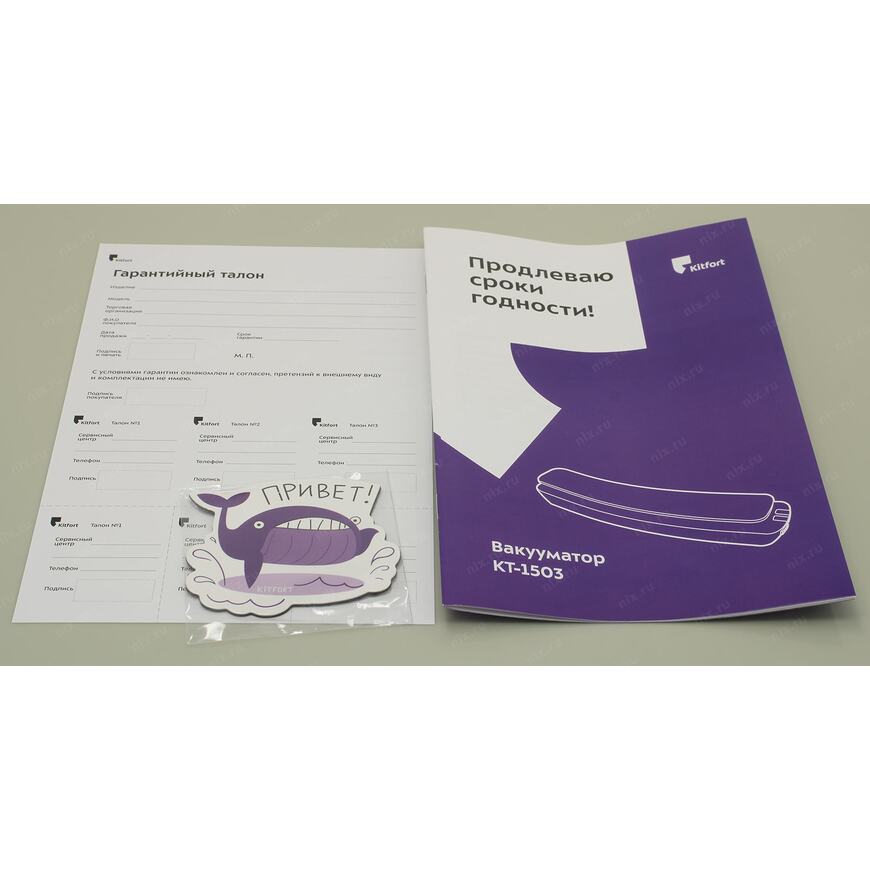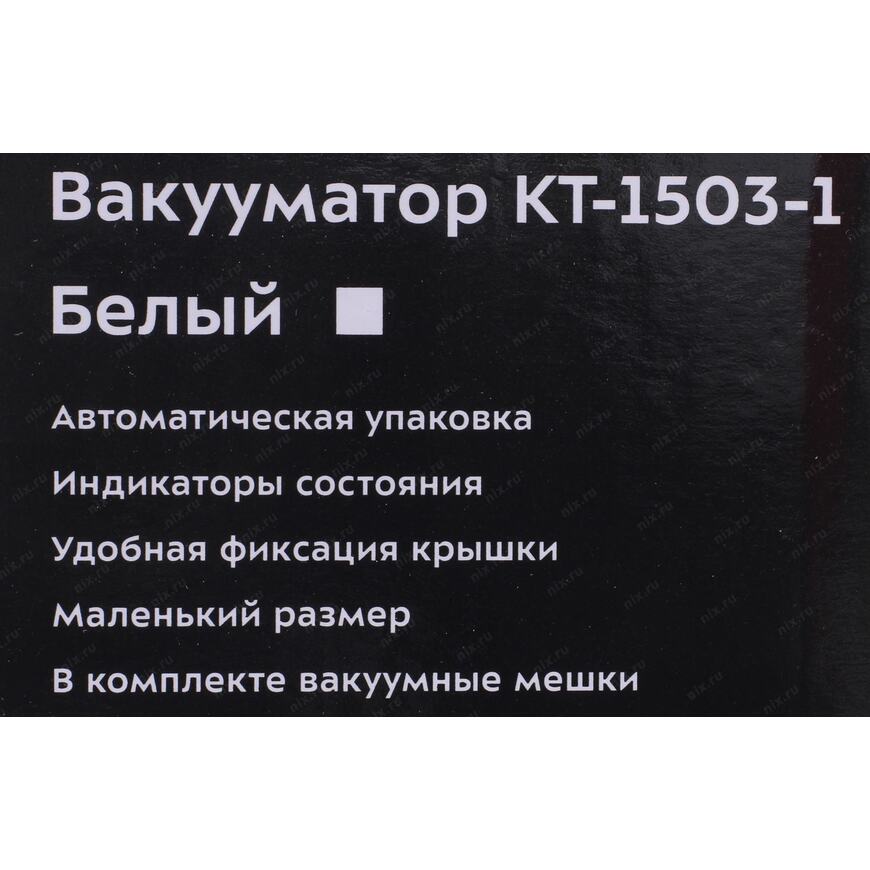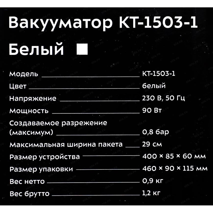 | Описание | Вакууматор Kitfort КТ-1503 современный прибор, призванный увеличить сроки хранения пищевых продуктов. Продукты, упакованные под вакуумом, сохраняют свежесть и не портятся существенно дольше по сравнению с обычными условиями хранения. Создаваемое разряжение (максимум): 0,8 бар. |