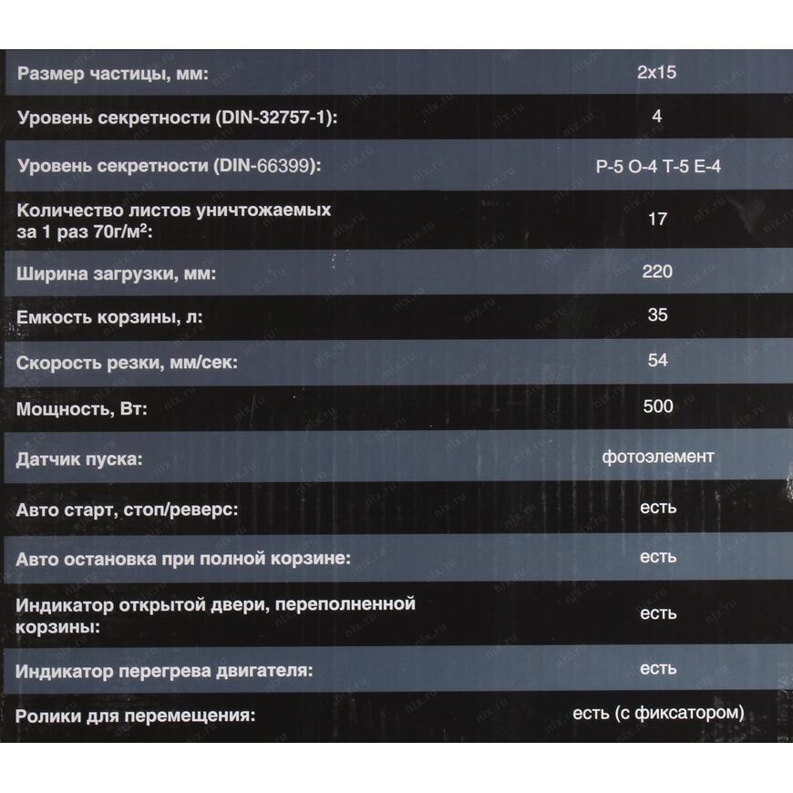 | Уровень секретности | P-5 (DIN 66399), 4 (DIN 32757), T-5 (DIN 66399) для кредитных карт, O-4 (DIN 66399) для CD-дисков, E-4 (DIN 66399) для карт памяти |