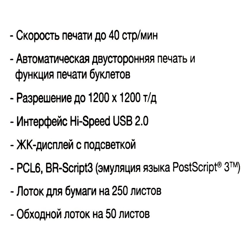 | Описание | Принтер лазерный Brother HL-L5000D черный, лазерный, A4, монохромный, ч.б. 40 стр/мин, печать 1200x1200, лоток 250+50 листов, USB, автоматическая двусторонняя печать |