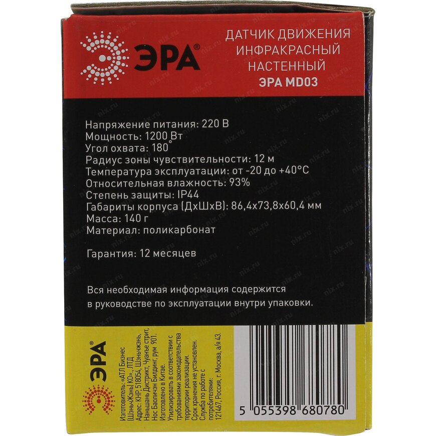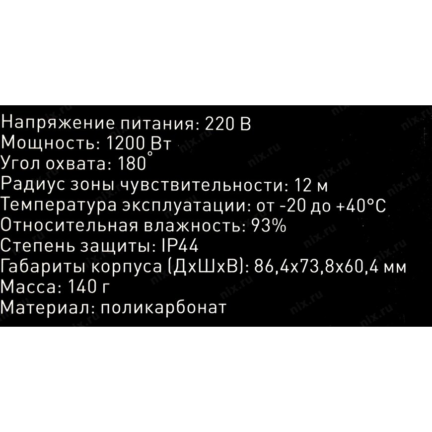 | Описание | Датчик освещенности/движения настенный для автоматического управления освещением Подключение светильника до 1200 Вт Время задержки от 10 секунд до 7 минут Освещенность 3-2000 LUX |