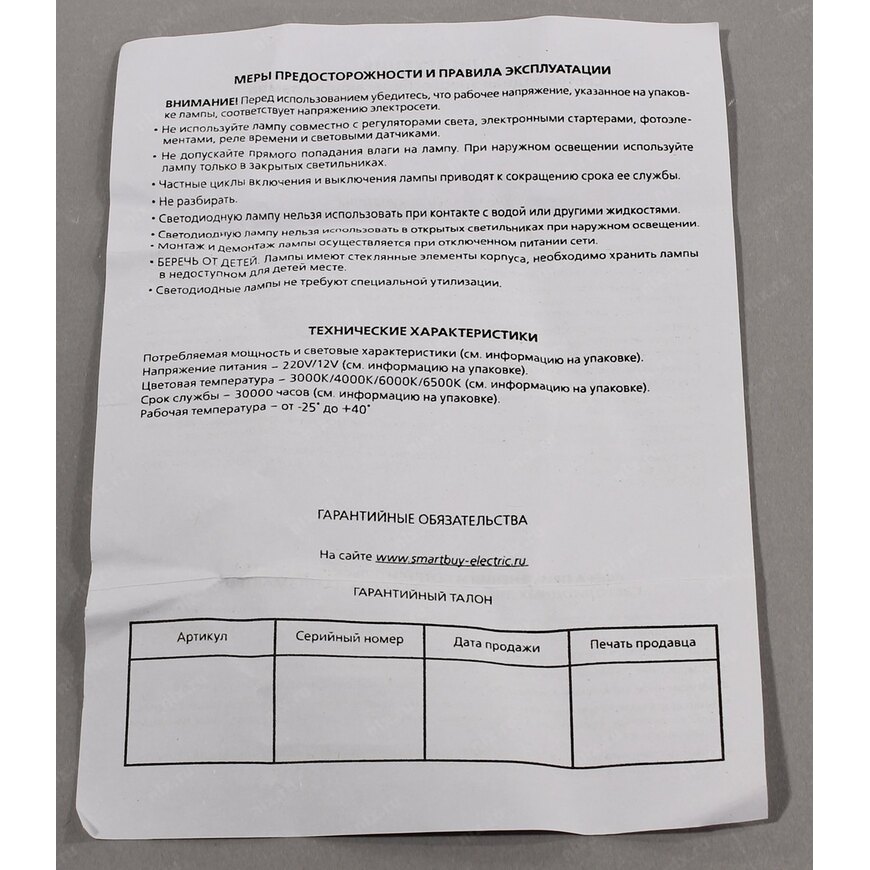 | Цветовая температура | 3000К (тёплый белый свет) |