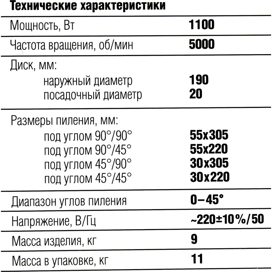 | Глубина пропила | 55 х 305 мм (под углом 90/90°), 30 х 220 мм (под углом 45/45°) |