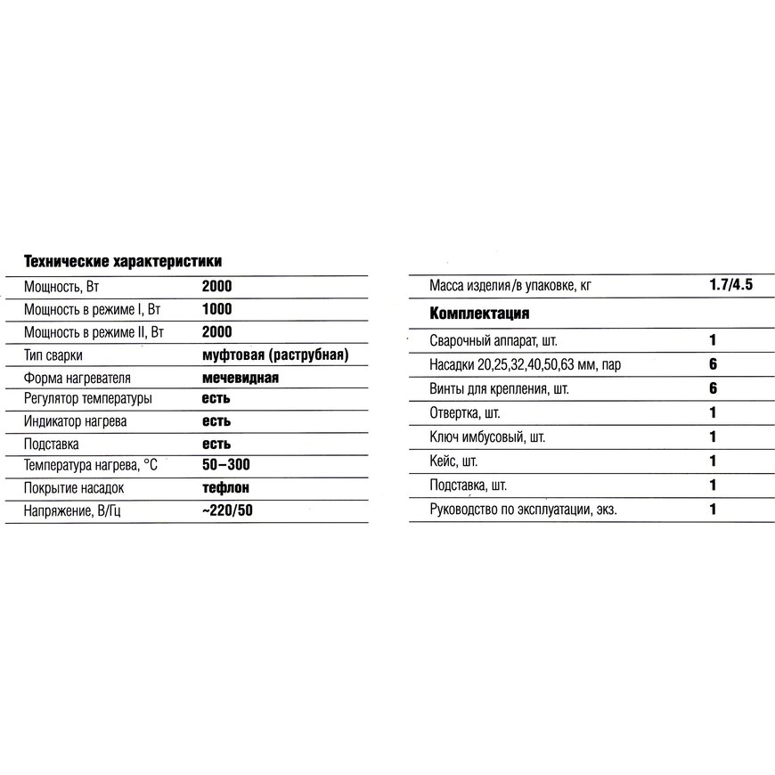 | Диаметр свариваемых труб | 20, 25, 32, 40, 50 и 63 мм |