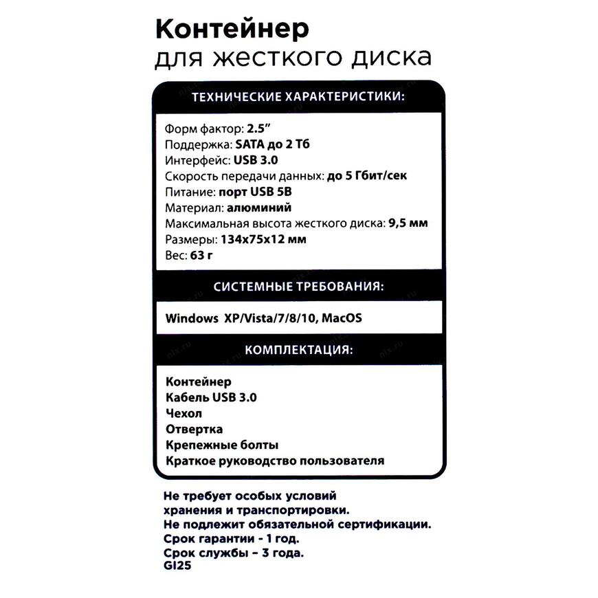 | Описание | Универсальный внешний контейнер для устройств с интерфейсом Serial ATA |