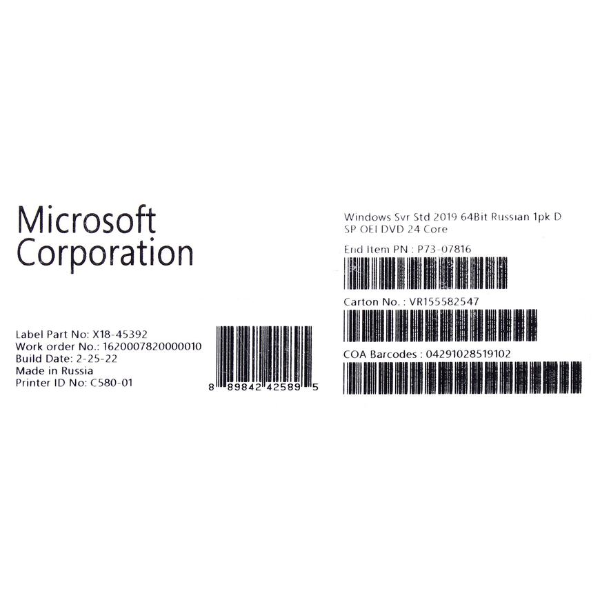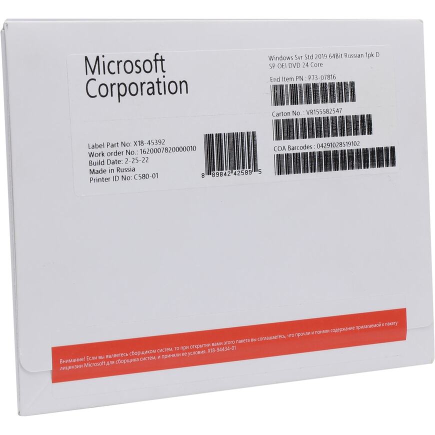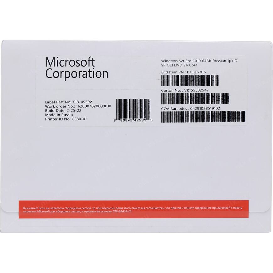 Windows Server Std 2019 64B RUS 1PK 24Core комплект (OEM)