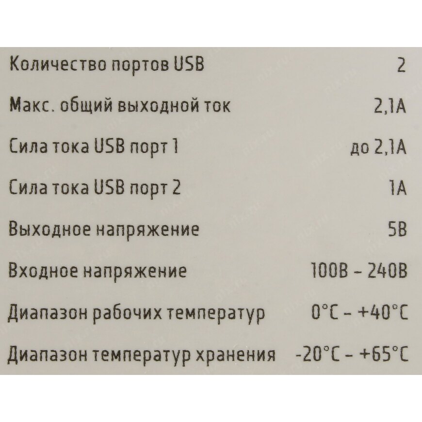 | Описание | Зарядное устройство с двумя USB портами и силой тока до 2.1 А на одном из портов для мобильных устройств (максимальная мощность 10 Вт). |