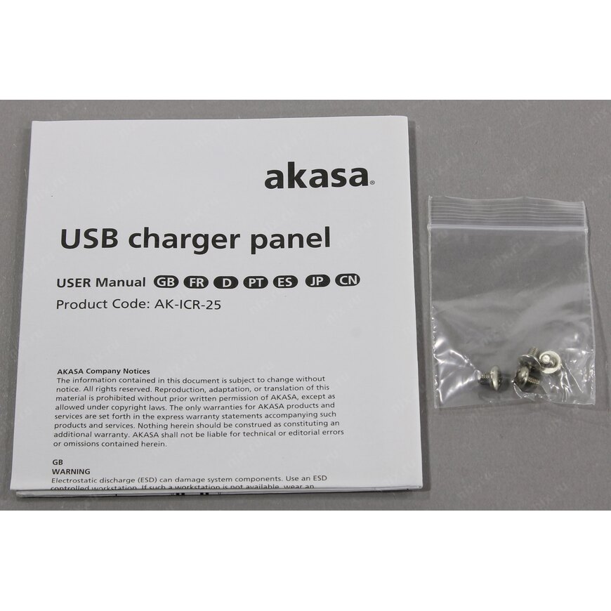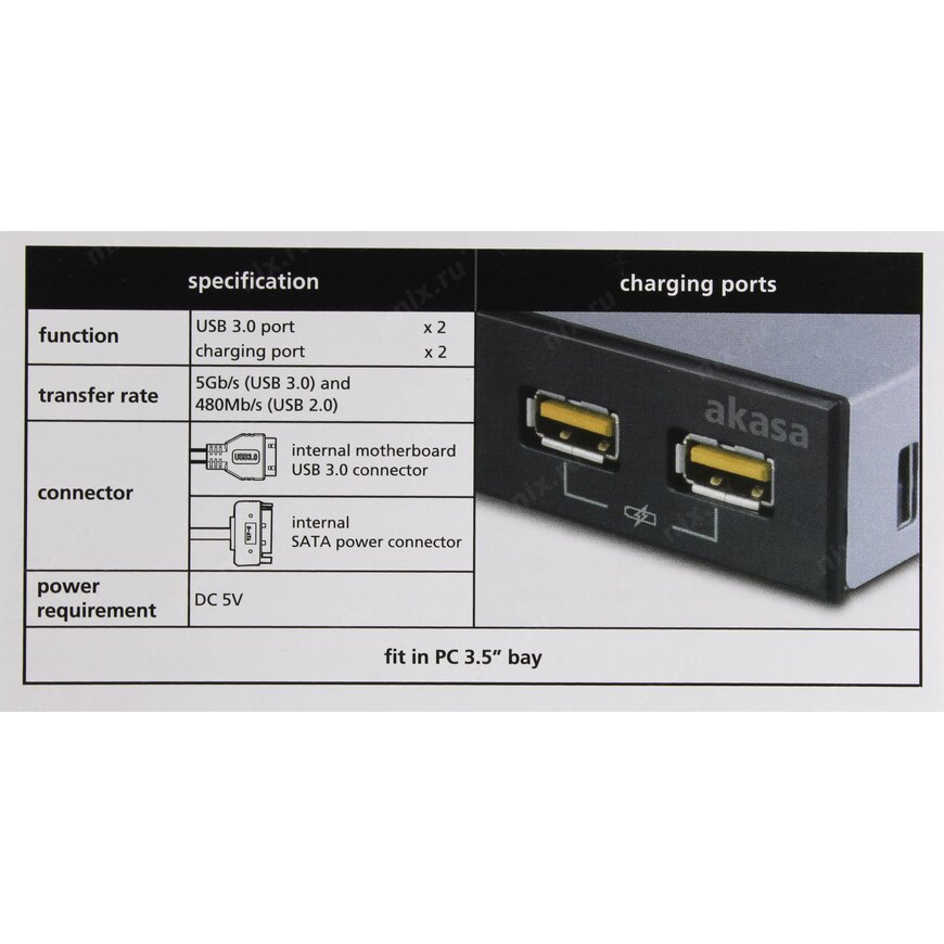 | Описание | Панель с двумя портами USB3.0 (подключение к 20-пин разъему на материнской плате) и двумя портами быстрой зарядки (2.4 А каждый, без передачи данных). Порты зарядки поддерживают спецификацию Battery charging specification 1.2 (BC1.2). Панель устанавливается в отсек 3.5". |
