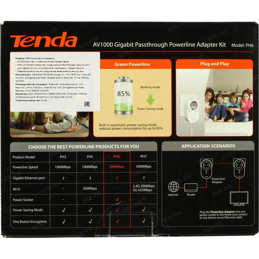 Tenda PH6 набор 2хPowerLine адаптеров AV1000 с проходной Евро розеткой