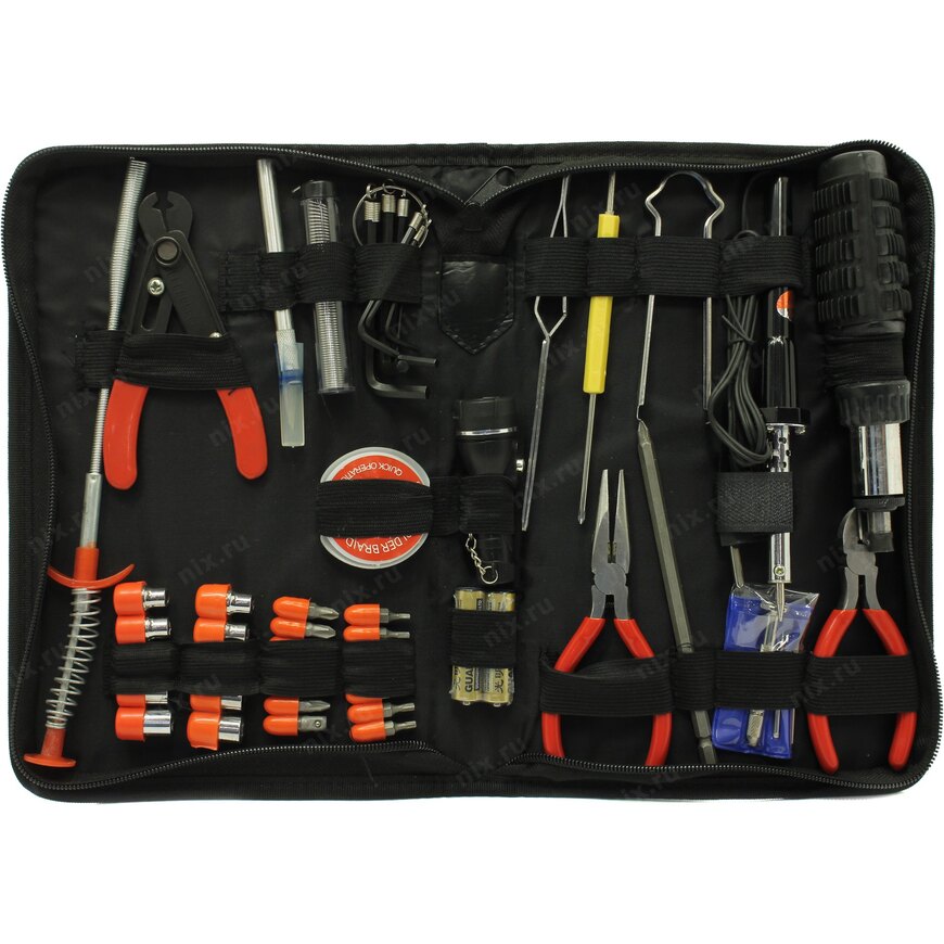 | Описание | Набор инструмента в футляре включает паяльник 30 Вт, припой, пинцеты двух типов, когтевой захват гибкий, длинногубцы 135 мм, бокорезы 120 мм, реверсивную отвертку с трещеткой, набором бит (14 шт.), торцевых головок (10 шт.), зажим, клещи для зачистки проводов, часовые отвертки для точных работ. В комплект также входит фонарик, батарейки к нему, набор Г-образных шестигранников, скальпель и чехол размером 385 x 190 x 40 мм |