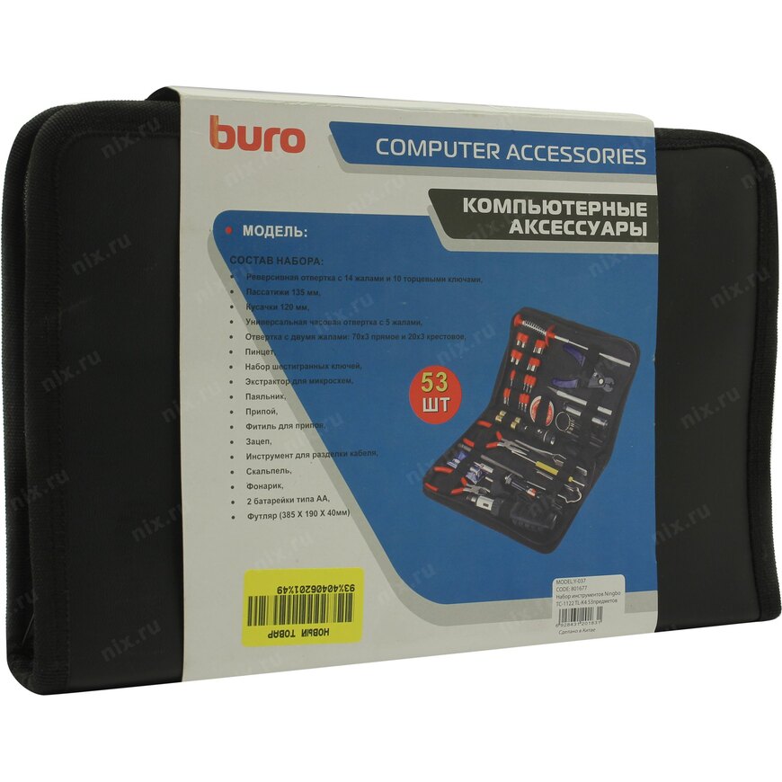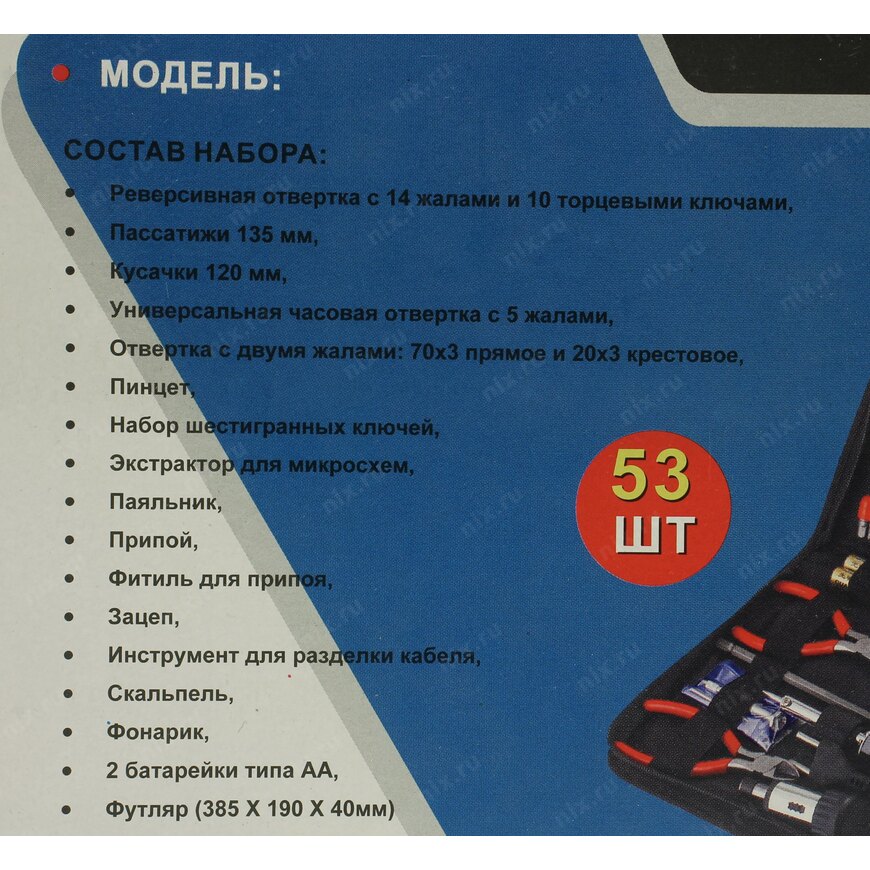 | Тип инструмента в наборе | Торцевые головки 1/4", Адаптер для бит (квадрат 1/4" F -> шестигранник 1/4" F), Отвёртка-вороток для бит (шестигранник 1/4"), Вставки (биты) 1/4", Шестигранный ключ (Г-образный), Отвертка шлицевая (с прямым шлицем SLOT), Отвертка крестообразная (PHILLIPS), Отвертка с иглой (Needle), Длинногубцы, Инструмент для обрезки/зачистки проводов, Фонарик светодиодный, Пинцет, Скальпель, Когтевой захват, Паяльник, Фонарик |