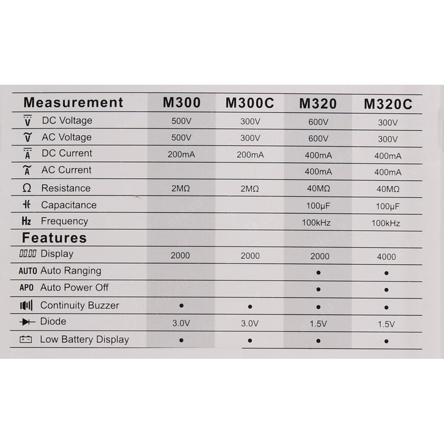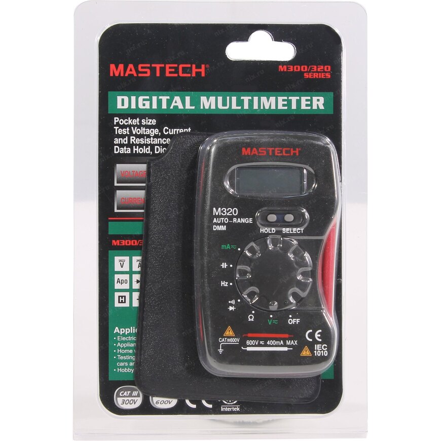 | Возможности мультиметра | "Прозвон" диодов, Замер ёмкости конденсаторов, Замер коэффициента усиления транзистора по току (hFE), Замер напряжения переменного тока (В), Замер напряжения постоянного тока (В), Замер силы переменного тока (А), Замер силы постоянного тока (А), Замер сопротивления проводника (Ом), Проверка целостности цепи, Измерение частоты |