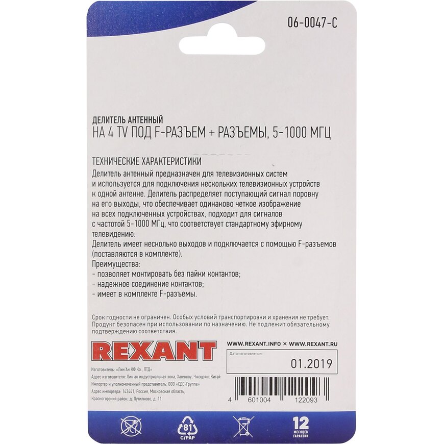 Антенный разветвитель (ТВ-сплиттер) Rexant 06-0047-C