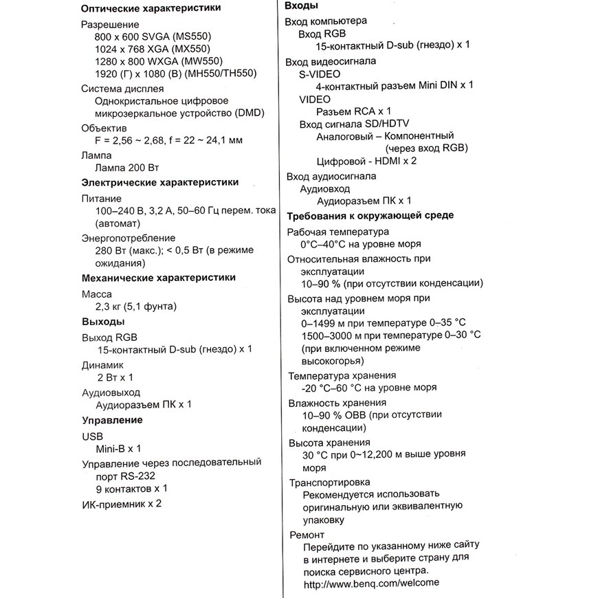 | Уровень шума проектора | 33 дБ в стандартном режиме, 29 дБ в Eco-режиме |