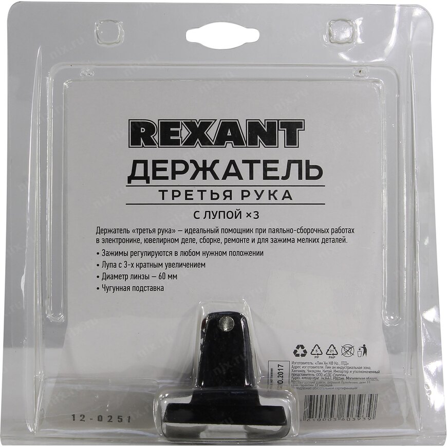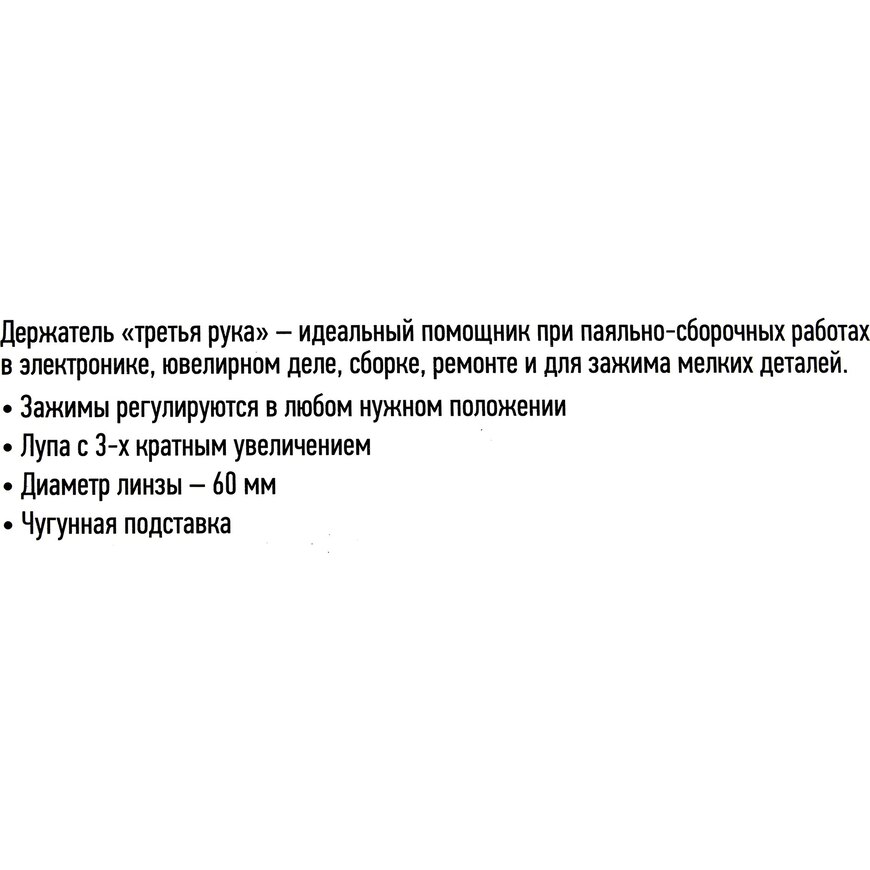 | Описание | Держатель профессионального уровня предназначен, в основном, для паяльных или сборочных работ, поэтому его и назвали "третья рука". Два зажима типа "Крокодил". Держатель оснащён лупой с увеличением x3. Устойчивое чугунное основание. "Третья рука" Rexant идеально подойдёт для проведения паяльно-сборочных работ в электронике, ювелирном деле, для сборки и ремонта мелких деталей. |