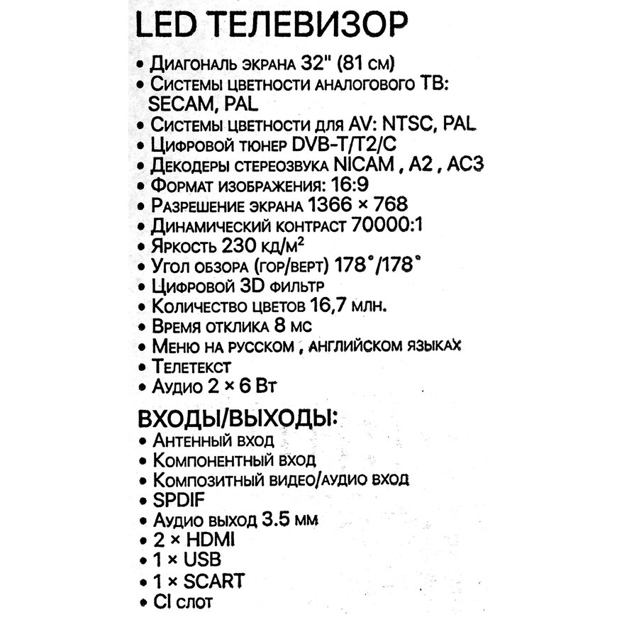 | Тюнер | Аналоговый, Цифровой DVB-T2, Цифровой DVB-T, Цифровой DVB-C (кабельный) |