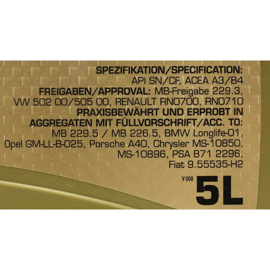 | Соответствие спецификациям | SN, A3/B4, CF, MB 229.3, Renault RN 0700 / RN0710, VW Group 502 00 / 505 00, BMW Longlife-01, Chrysler MS-10850 / MS-10896, Fiat 9.55535-H2, MB 229.5, MB 226.5, Opel/GM GM-LL-B-025, Porsche A40, PSA B71 2296 |