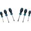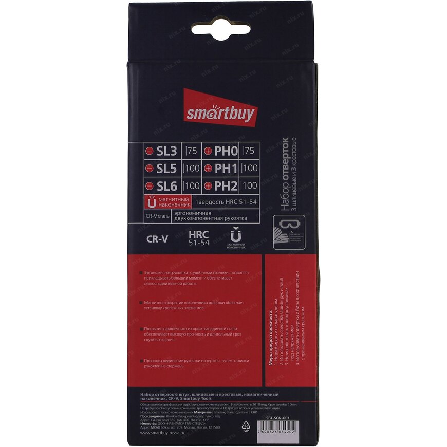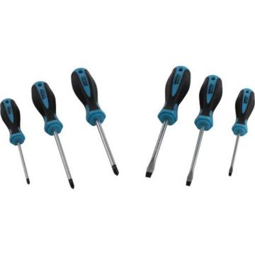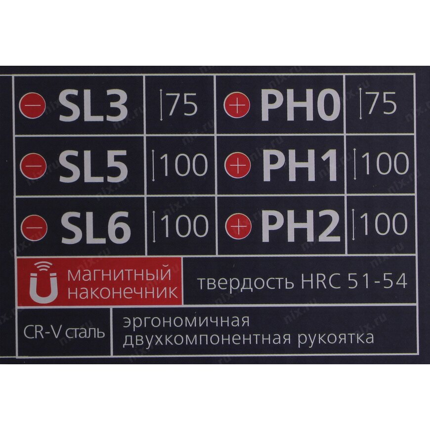 Отвертки с прямым шлицем и крестовые отвертки. В наборе 6 штук. Отвертки сделаны из хром-ванадиевых стержней с круглым профилем и закалённой намагниченной рабочей частью, а также имеют двухкомпонентные ручки эргономичной формы, что обеспечивает надёжных захват инструмента