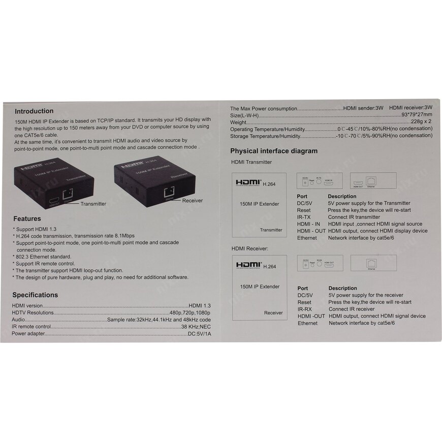 | Описание | Устройство для передачи сигнала HDMI с максимальным разрешением 1920x1080 на расстояние до 150 метров через сетевой кабель UTP категории 6. Возможна передача управляющих сигналов от инфракрасных пультов ДУ при помощи проводных сенсора и передатчика. Передающая сторона поддерживает сковозное HDMI подключение. |