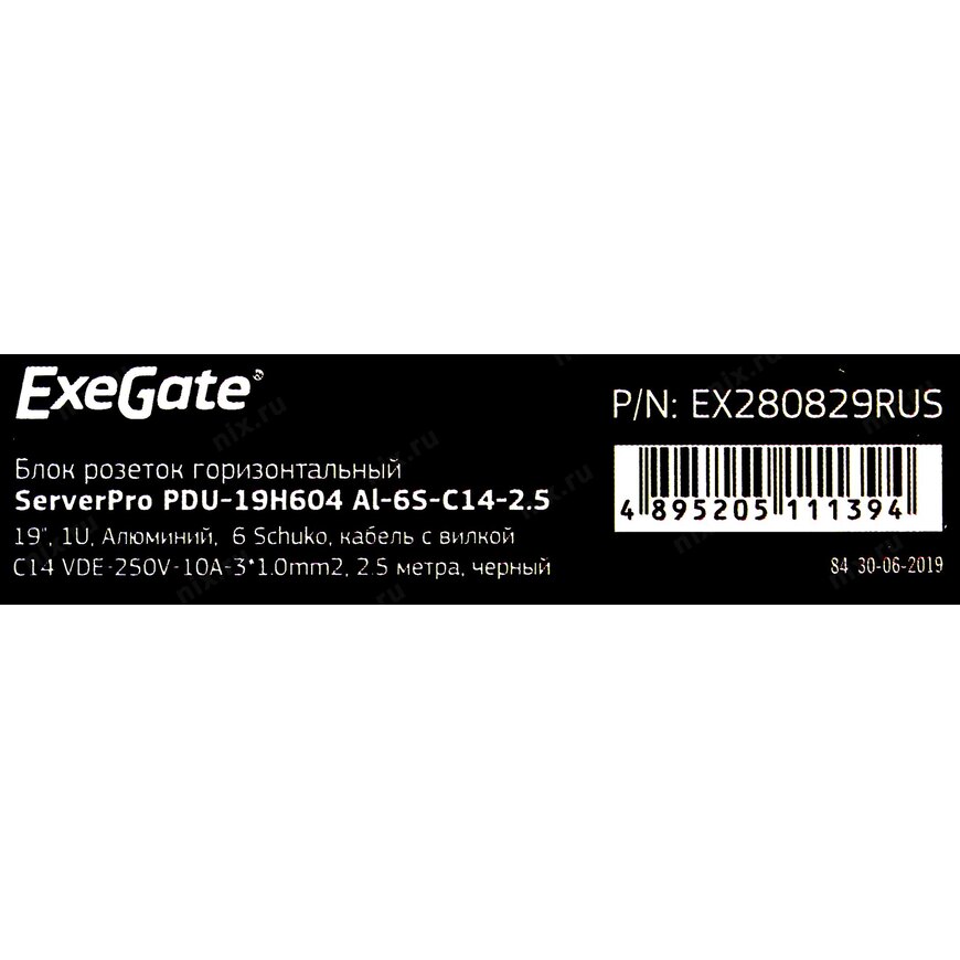 < NEW> < EX280829RUS> ExeGate ServerPro PDU-19H604 Al-6S-C14-2.5, 19\", 1U, Алюминий, 6 Schuko