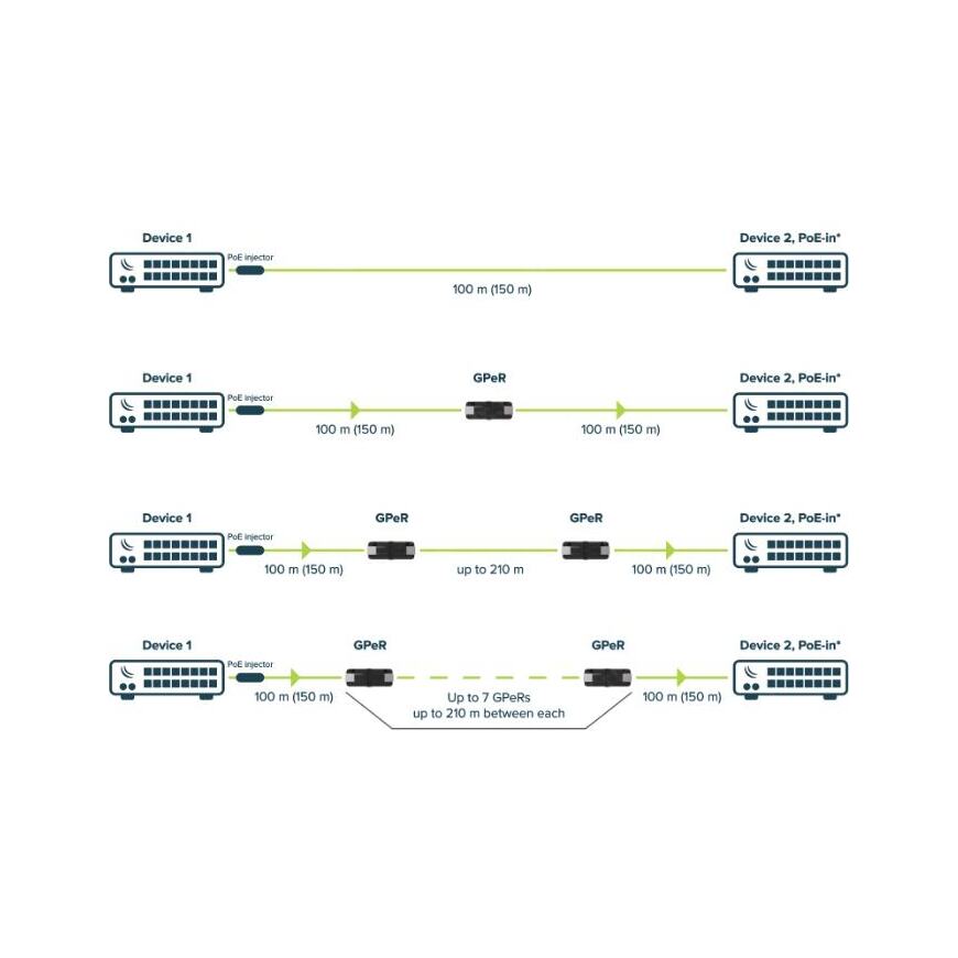 Пассивный гигабитный Ethernet-повторитель (усилитель сигнала). Используется при увеличении стандартного для кабеля Ethernet расстояния (100м) до 210 метров. Используя несколько повторителей, расстояние возможно увеличить до полутора километров.