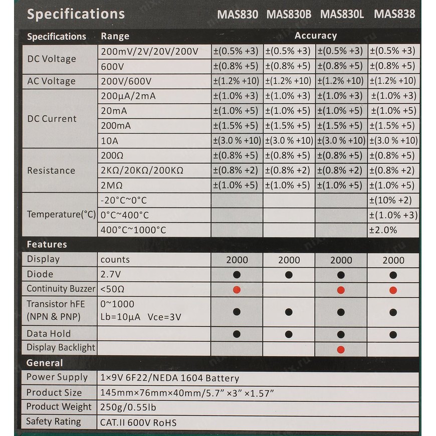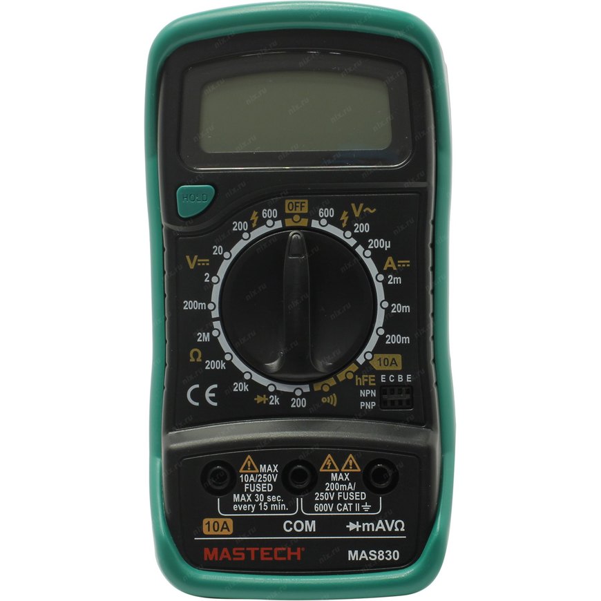 | Возможности мультиметра | "Прозвон" диодов и транзисторов, Замер коэффициента усиления транзистора по току (hFE), Замер напряжения переменного тока (В), Замер напряжения постоянного тока (В), Замер силы постоянного тока (А), Замер сопротивления проводника (Ом), Проверка целостности цепи |