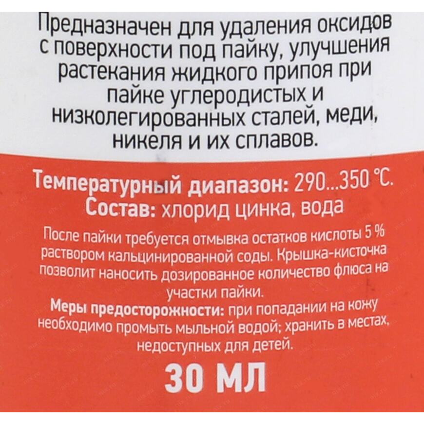 | Описание | Флюс для пайки и лужения углеродистых и низколегированных сталей, меди, никеля и их сплавов. Предназначен для удаления оксидов металлов, которые мешают "прилипанию" припоя, с поверхностей припаиваемых деталей. Состав: хорид цинка и вода. Остатки кислоты требуют смывания 5% раствором кальцинированной соды. |