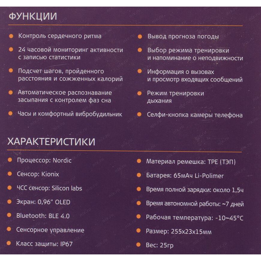 | Прочее | Умный будильник; Режим тренировки дыхания; Процессор Nordic; Сенсор Kionix; ЧСС сенсор Silicon Labs |